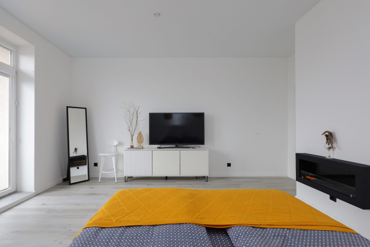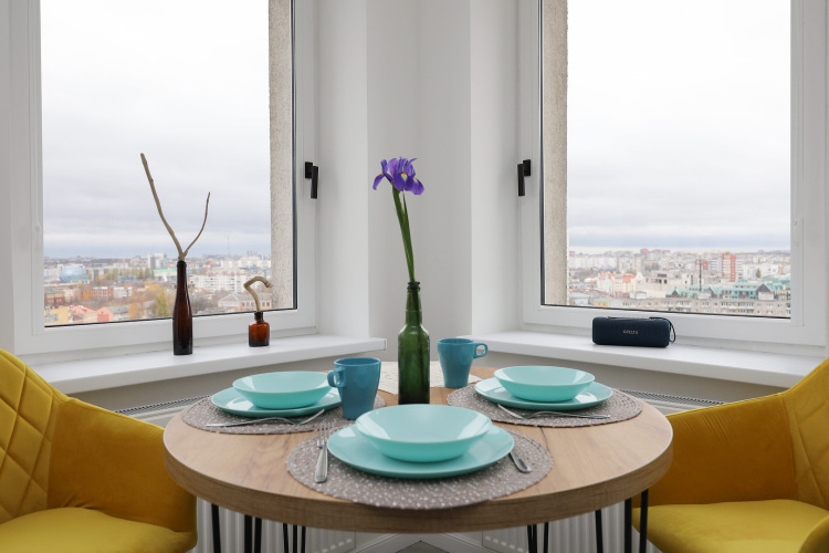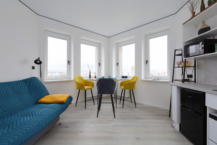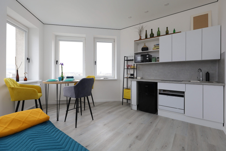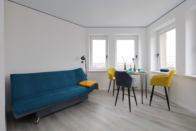 Квартира рассчитана на проживание до 3 человек. В спальне установлена двуспальная кровать с ортопедическим матрасом, телевизор. Кухня-гостиная оборудована раскладным диваном с ортопедическим основанием, обеденной зоной, посудомоечной машиной, холодильником, индукционной варочной поверхностью, посудой. Имеется стиральная машина, сушилка, гладильные принадлежности, Wi-Fi. Окна выходят на филармонию и музей Мирового океана.