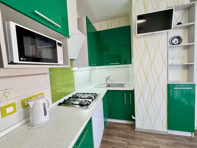 В квартире имеются необходимые для проживания удобства: двуспальная парящая кровать с подсветкой, бытовая техника, утюг, фен, постельное бельё, полотенца, посуда, бытовая химия, Smart TV, бесплатный Wi-Fi. Спальная комната — 20 кв.м.