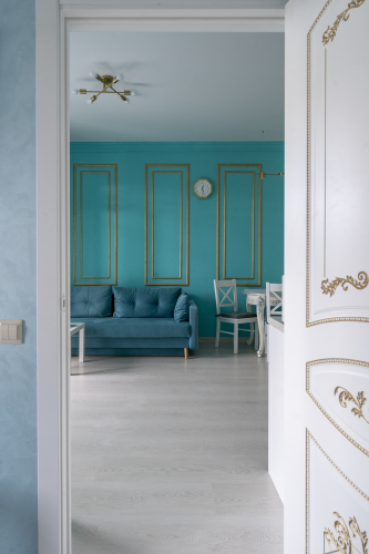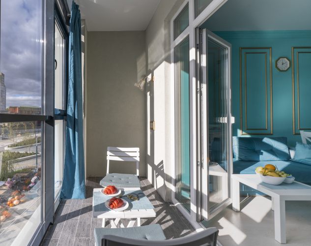 Площадь апартаментов — 55 кв. м. Из панорамных окон на 2 этаже 6-этажного дома открывается прямой вид на реку из всех помещений, кроме ванной комнаты. В распоряжении гостей 2 раздельных спальных места для размещения 4 гостей, также возможно размещение до 5 человек при установке дополнительной раскладной кровати по запросу. Установлено автономное отопление, есть 2 санузла, ванна, стиральная машина и полотенцесушитель. Кухня-гостиная оборудована варочной панелью, посудомоечной машиной, микроволновой печью, холодильником, электрочайником, кофемашиной, тостером, обеденным столом и необходимой посудой. В апартаментах предусмотрены телевизоры с доступом в Интернет, Wi-Fi, фен, средства гигиены, банные полотенца, халаты, одноразовые тапочки, пылесос, вертикальный отпариватель со встроенной гладильной доской.