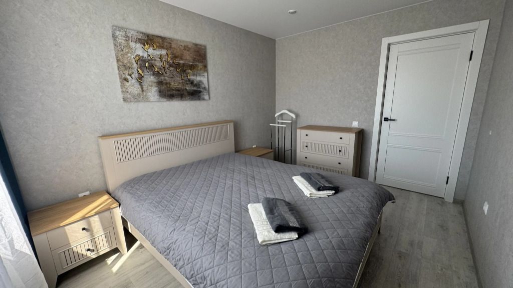 В гостиной есть раскладной диван, в спальне — двуспальная кровать. В квартире могут расположиться до 6 гостей, включая младенца. В распоряжении гостей: полотенца, постельное бельё, халат, тапочки, столовые приборы, посуда, кастрюли, сковородки, чайник, smart-телевизор, капсульная кофемашина, микроволновая печь, холодильник, стиральная и посудомоечная машины, фен, утюг, гладильная доска, Wi-Fi.