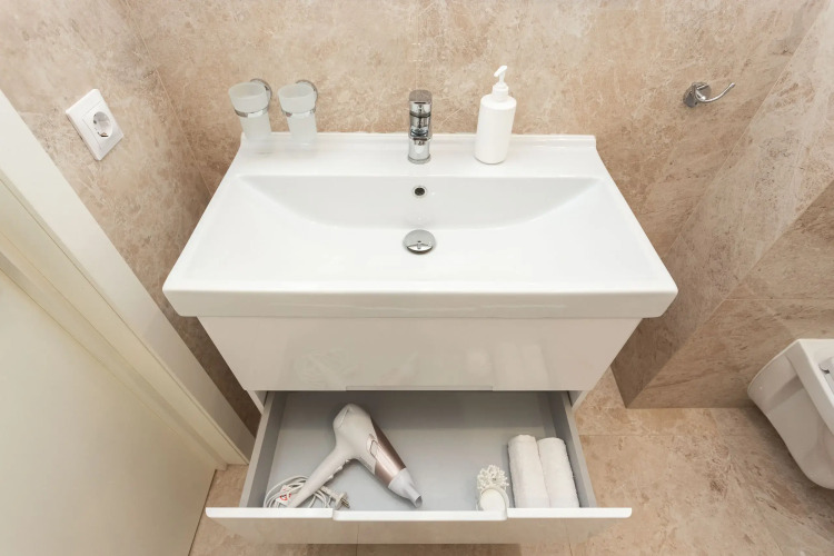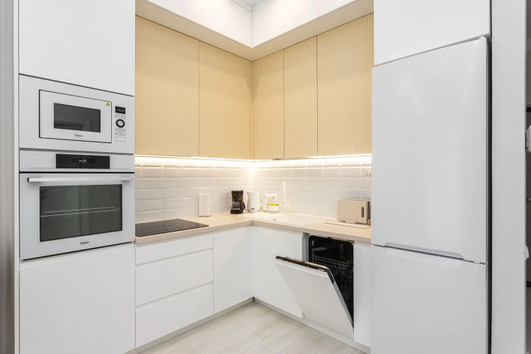 Полноценная кухня оборудована всем необходимым для проживания: варочной поверхностью, микроволновой печью, духовым шкафом, посудомоечной машиной, холодильником, чайником и фильтром для питьевой воды.