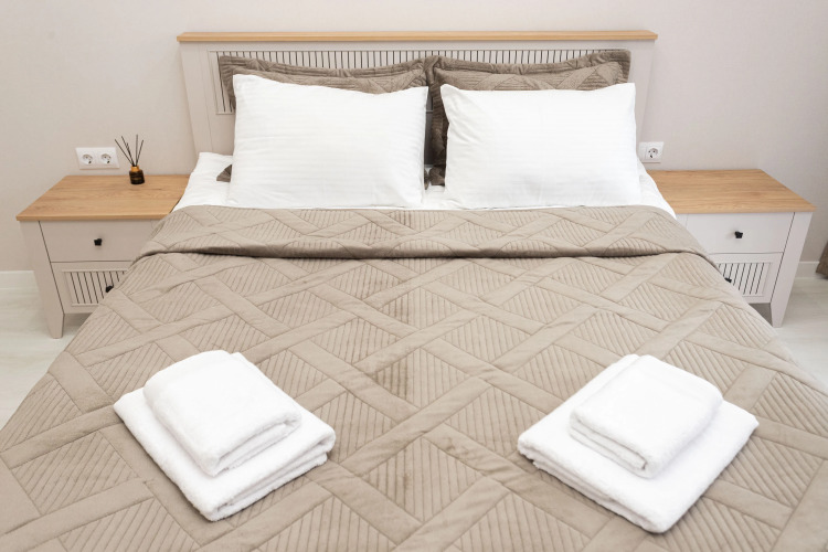 В спальне есть двуспальная кровать, в гостиной — раскладной диван, постельное бельё и принадлежности.