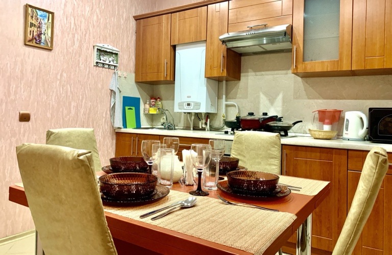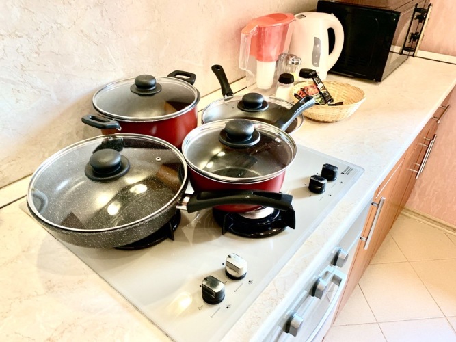 Имеется два раздельных спальных места для размещения 4-х человек: кровать 160 см и раскладной диван 140 см. В квартире есть необходимое комфортного проживания: посуда и столовые приборы, высокоскоростной Wi-Fi, телевизор, холодильник, микроволновая печь, стиральная машина, фен, фильтр для воды и чайник, гладильная доска с утюгом, варочная панель, электрический духовой шкаф, сушилка для одежды.