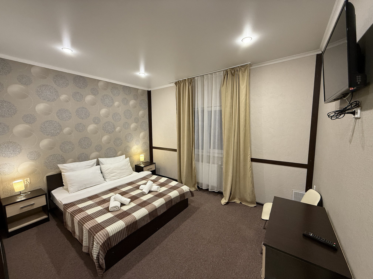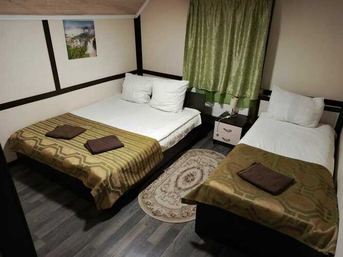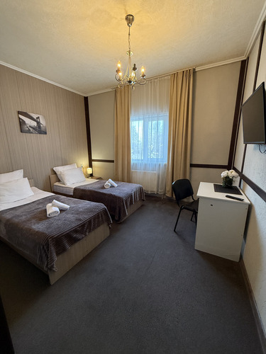 Номер «Эконом» (12 м²) — компактное и функциональное размещение для 1–2 гостей. В номере: удобные кровати, мебель, санузел с душевой кабиной и телевизор.