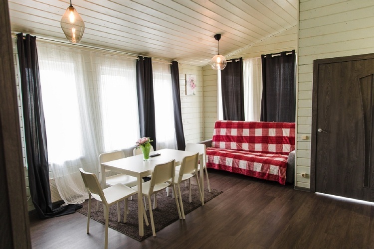 Размещение в коттедже с сауной (100 м²): 2 спальни, гостиная, кухня. Есть сауна с купелью, Wi‑Fi, ТВ и всё необходимое для комфортного пребывания большой компании.