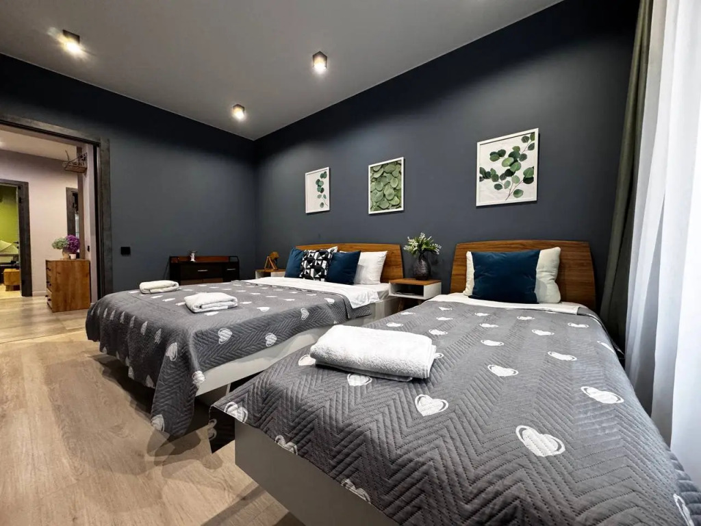 В квартире имеется 2 односпальной кровати, 2 двуспальные кровати и двуспальная диван-кровать. Также есть дополнительные складные кровати.