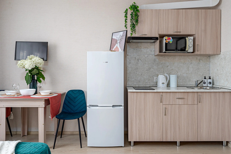 Гостям также доступна полноценная кухня с холодильником, микроволновкой, варочной панелью и всей необходимой посудой