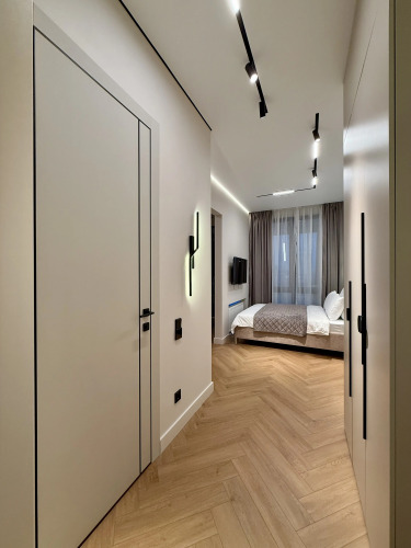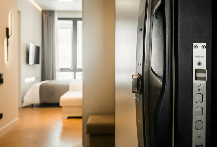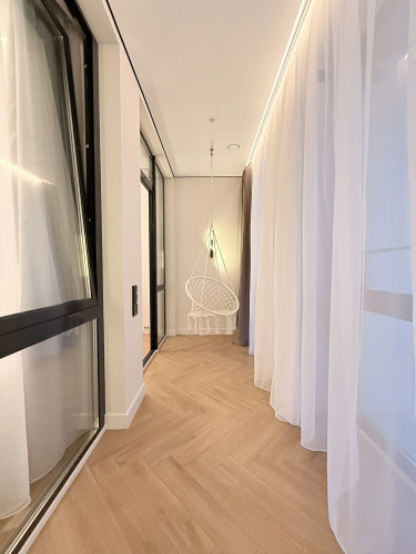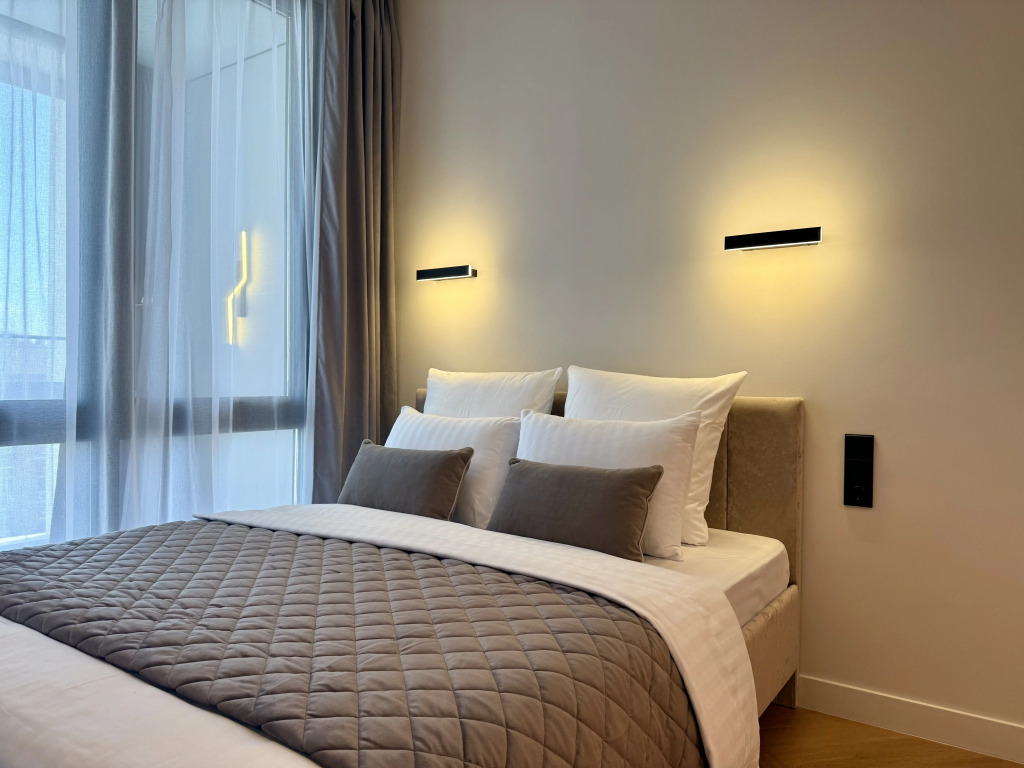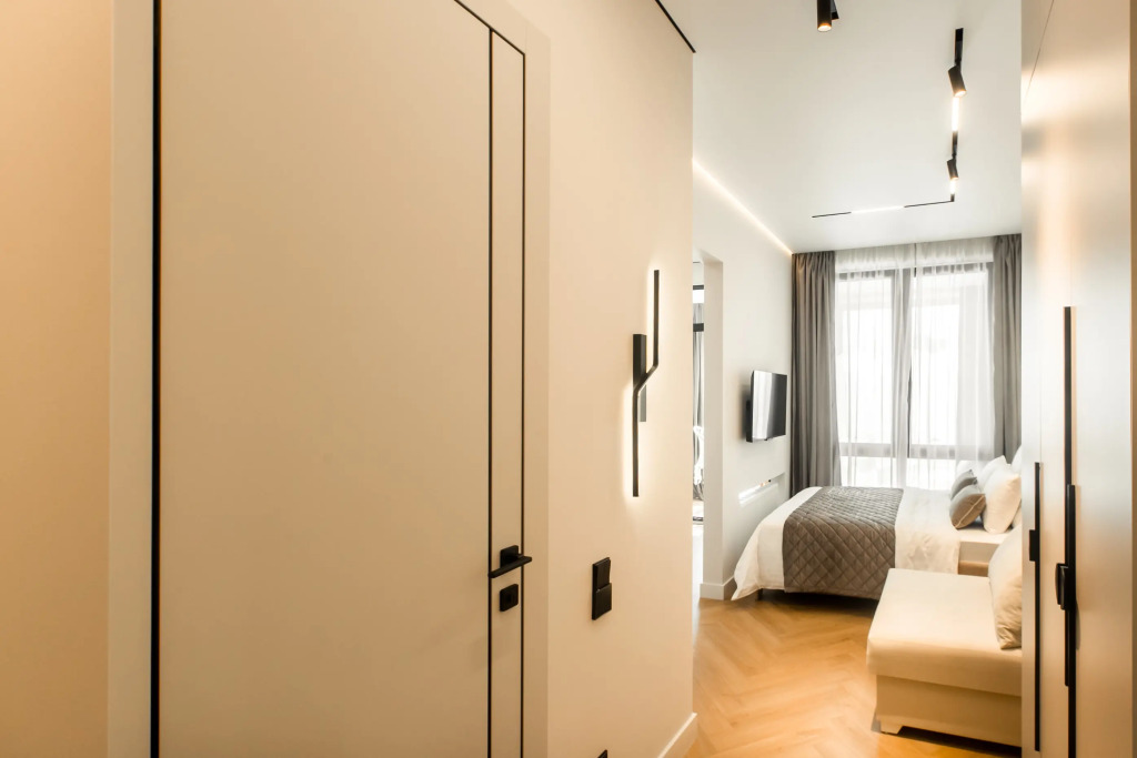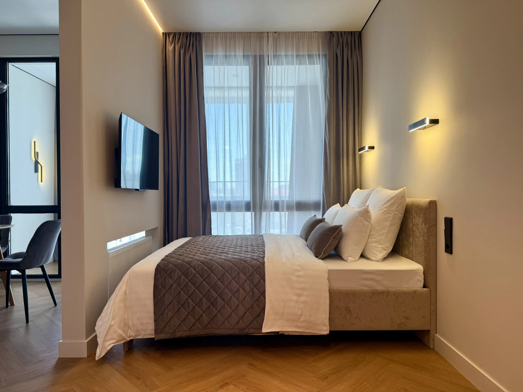 Апартаменты с панорамными окнами имеют дизайнерское оформление. Гостям доступна система «умный дом»: через умную колонку настраиваются свет, шторы, кондиционер, тёплые полы, телевизор и музыка. Кухня со встроенной техникой. Санузел с тропическим душем, тёплыми полами и сантехникой.