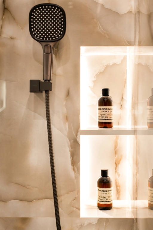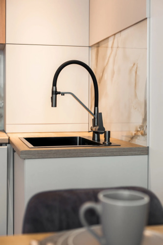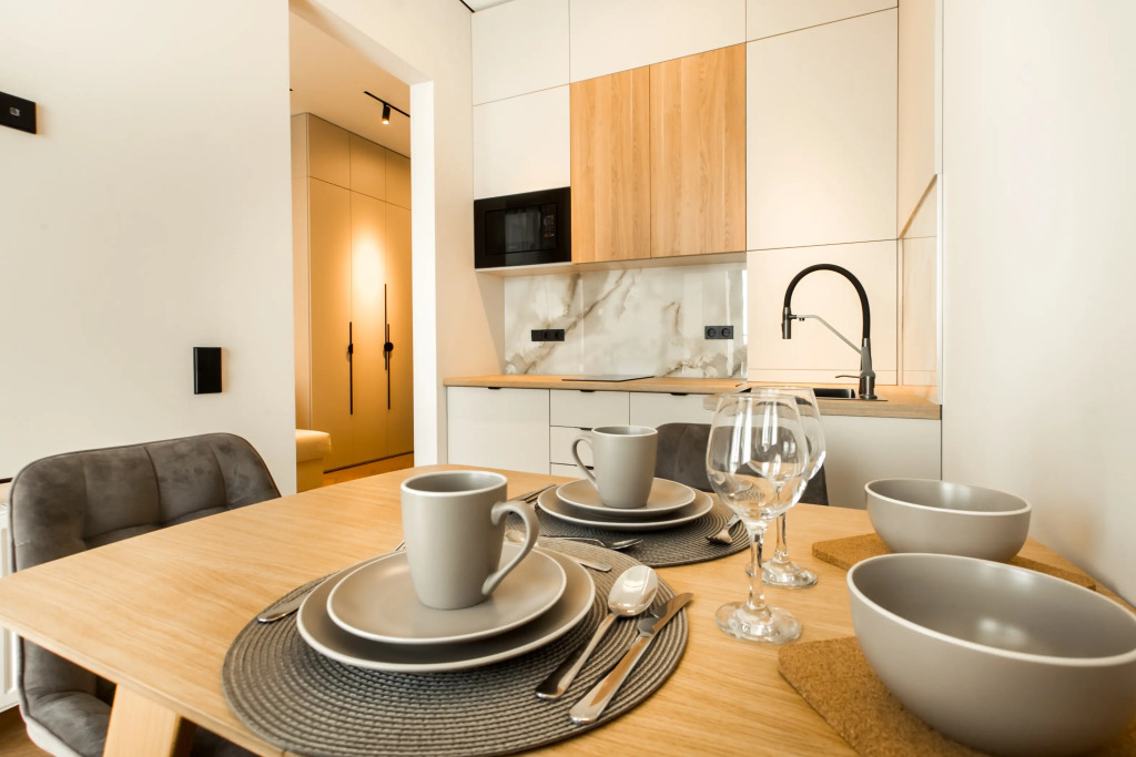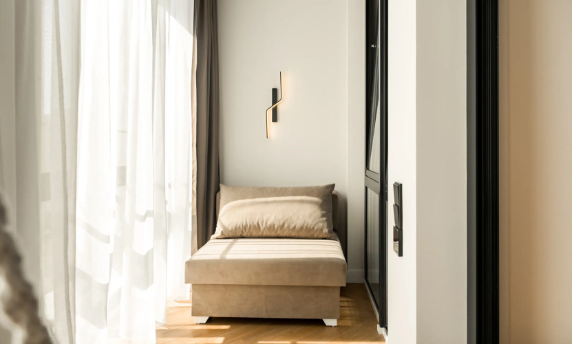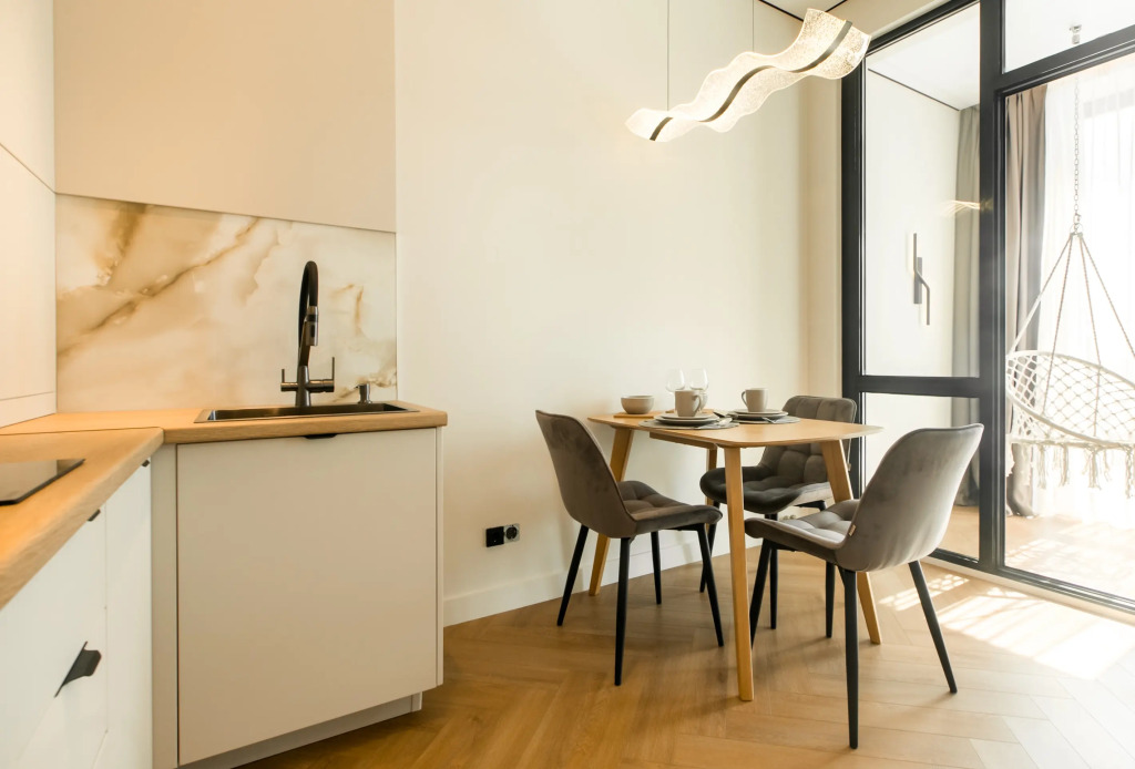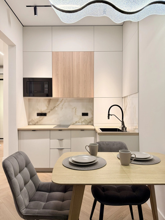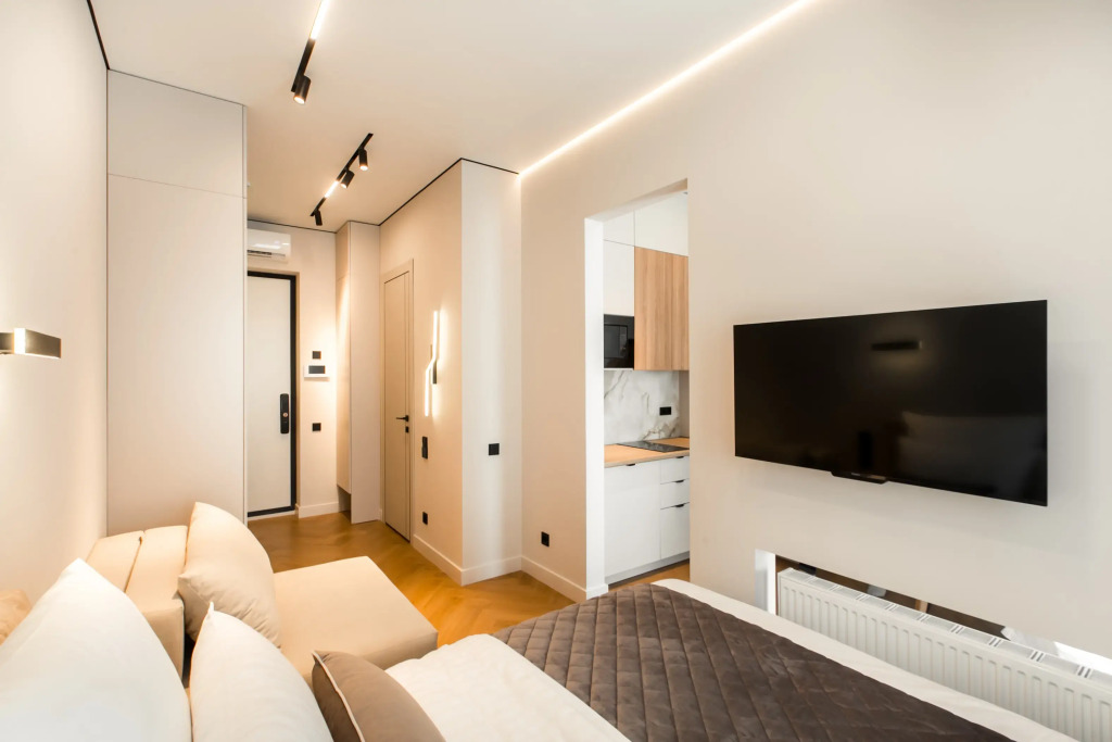 Апартаменты с панорамными окнами имеют дизайнерское оформление. Гостям доступна система «умный дом»: через умную колонку настраиваются свет, шторы, кондиционер, тёплые полы, телевизор и музыка. Кухня со встроенной техникой. Санузел с тропическим душем, тёплыми полами и сантехникой.