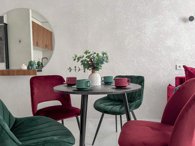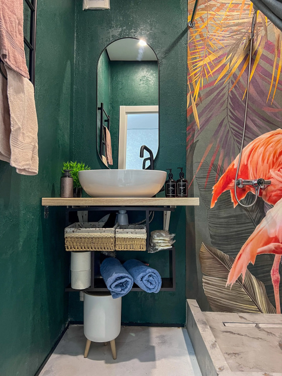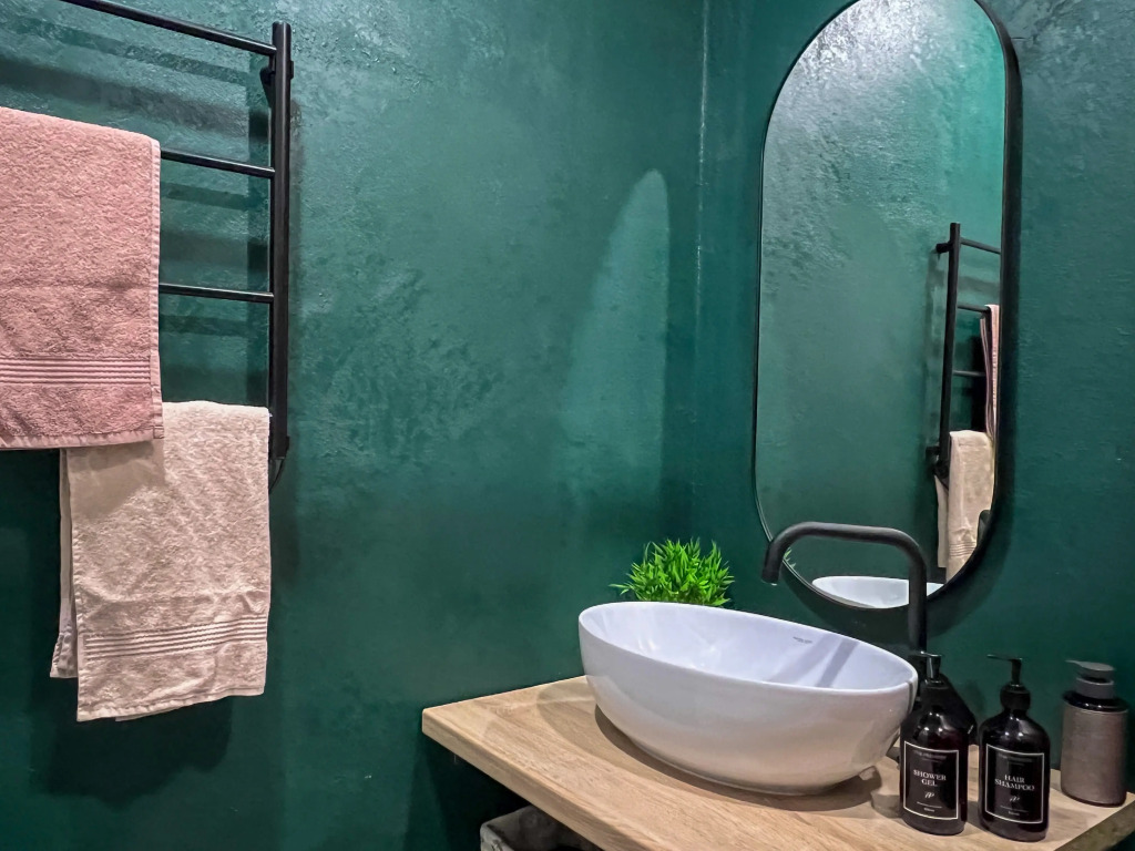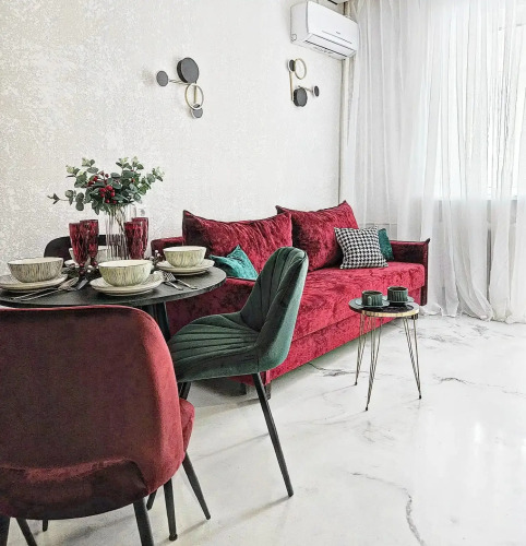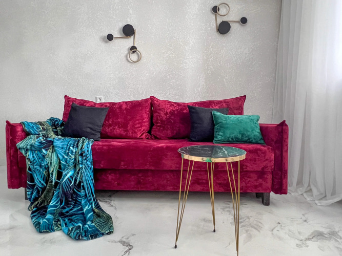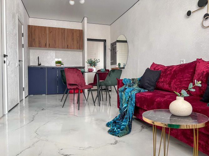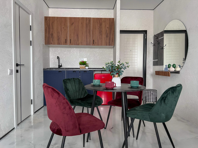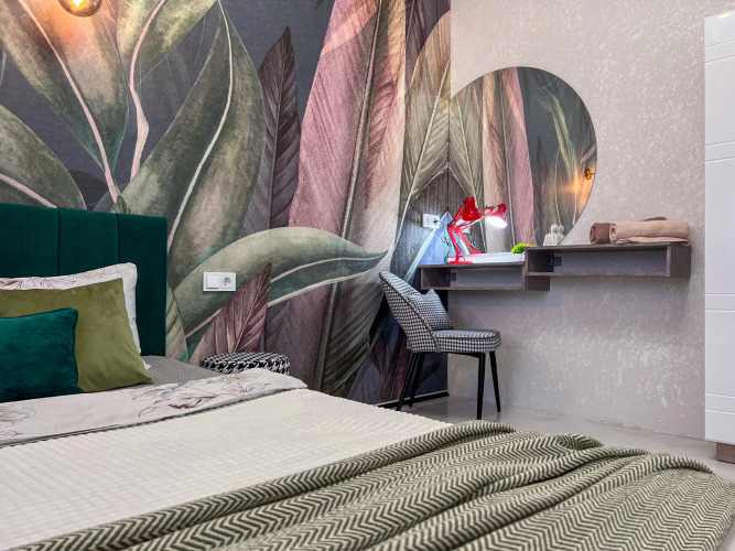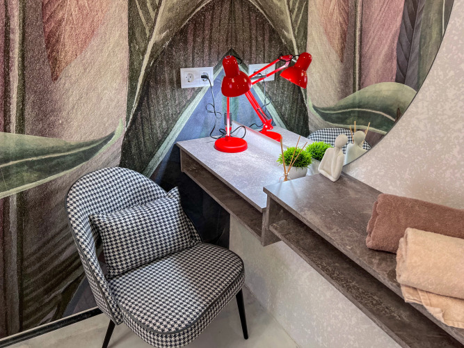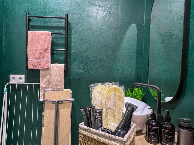 Работает бесплатный Wi-Fi. Припарковаться можно будет на парковке рядом. В апартаментах имеется утюг, телевизор и кондиционер. В распоряжение гостей спальня с кроватью 160х200 и кухня-гостиная с одним раскладывающимся диваном, размер дивана в разложенном состоянии — 155х200.