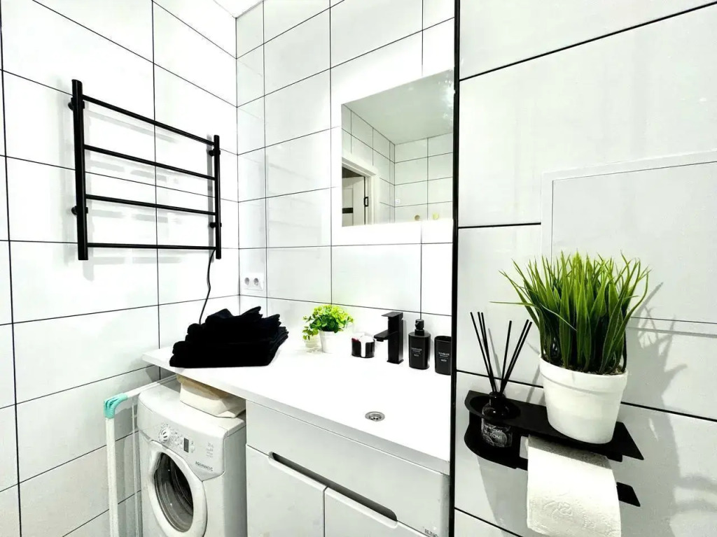 На кухне есть: холодильник, микроволновая печь, электрическая плита, чайник, посуда и кухонные принадлежности. Бытовая техника: стиральная машина, телевизор, утюг, фен.