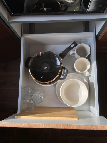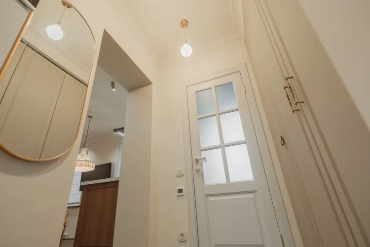В апартаментах — двуспальная кровать с ортопедическим матрасом и телевизор с голосовым помощником. Есть отреставрированный антикварный стол и итальянские стулья из массива ореха, оббитые натуральной кожей оливкового цвета.
