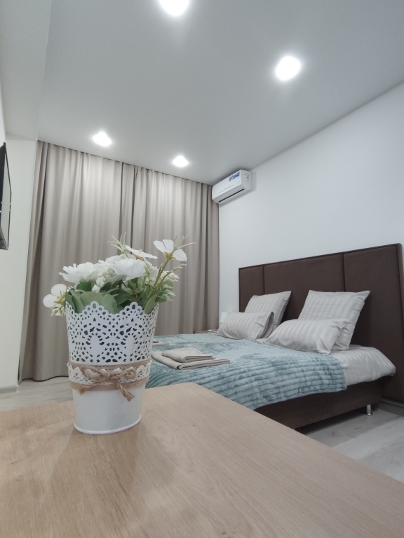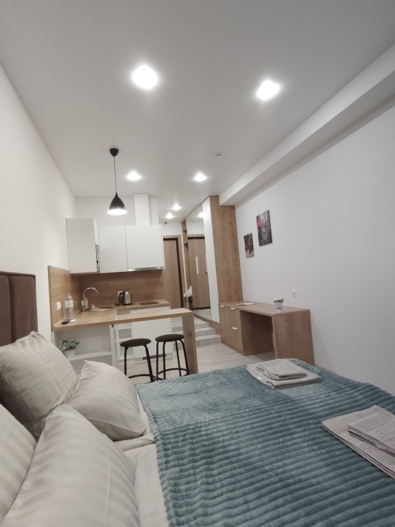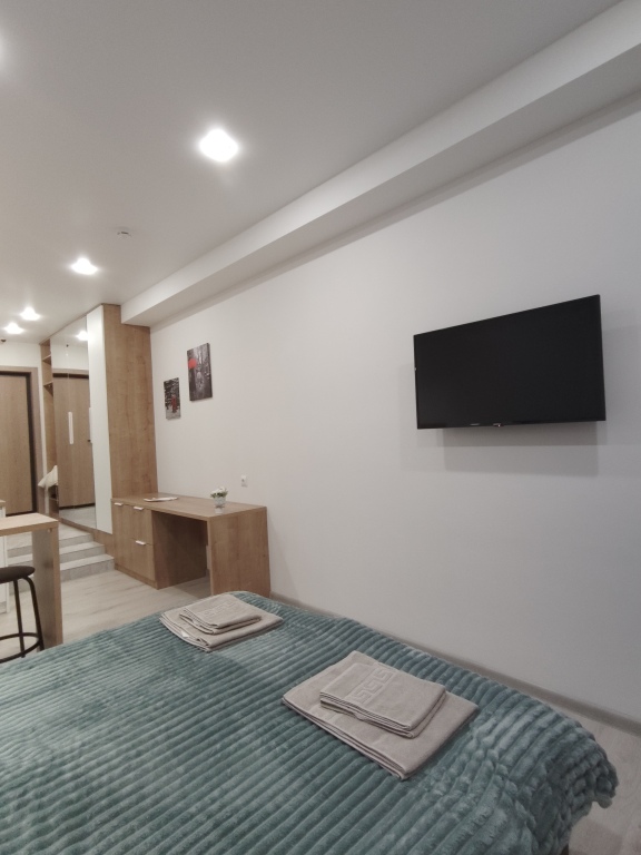 При заселении гостям предоставляются: набор полотенец, постельное бельё, шампунь, тапочки, двуспальная кровать, телевизор c кабельным телевидением, кондиционер, микроволновая печь, чайник, холодильник, электрическая плита, утюг, фен, Wi-Fi, столовые приборы и посуда на 2 персоны.