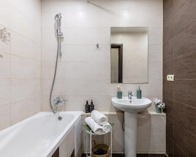 В наличии игровая приставка и телевизор смарт. На кухне можно найти посуду и столовые приборы, сковороды и кастрюли. Есть утюг, гладильная доска, стиральная машина, сушилка для белья, фен, ватные диски. Для удобства гостей постельное бельё и полотенца. В наличии гигиенический набор: гель для душа, шампунь.