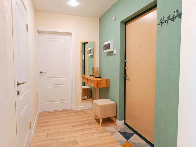 В квартире есть необходимое для проживания и отдыха: спальные места для 4-х гостей (2+2), свежее постельное бельё, Смарт ТВ, бесплатный Wi-Fi, оборудованная кухня с холодильником, микроволновой печью, плитой, духовкой, посудой и кухонной утварью, санузел с ванной и стиральной машиной, гигиенические принадлежности, фен, утюг и гладильная доска, а также бесплатный чай.