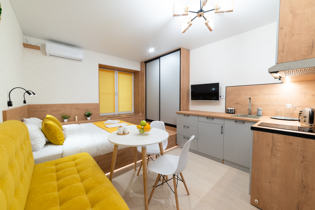 К удобствам гостей — кондиционер, телевизор, интернет, шумоизоляция, полотенца и тапочки, гладильная доска, утюг, ролики для одежды и фен.