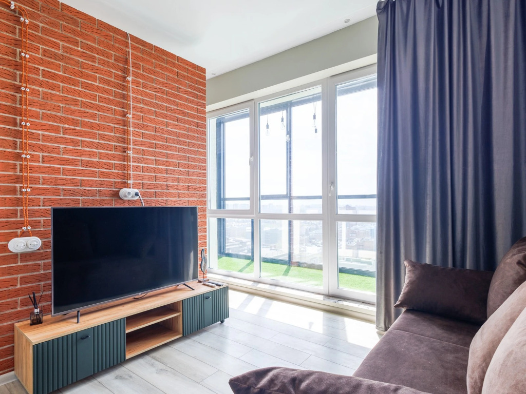 Апартаменты оборудованы необходимым для комфортного проживания: кондиционер, двуспальная кровать 160х200 см с ортопедическим матрасом и раскладывающийся диван, шкаф для одежды и прихожая с вешалкой, лоджия с панорамными окнами и видом на город, холодильник, микроволновая печь, электрическая плита, чайник и комплект посуды, водонагреватель, телевизор и высокоскоростной Wi-Fi.