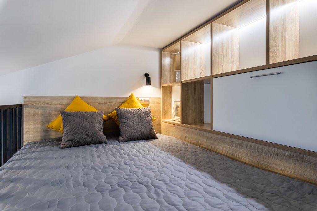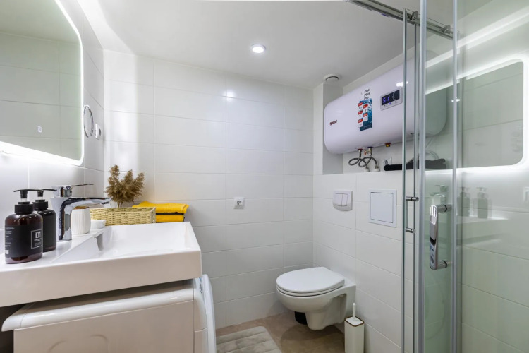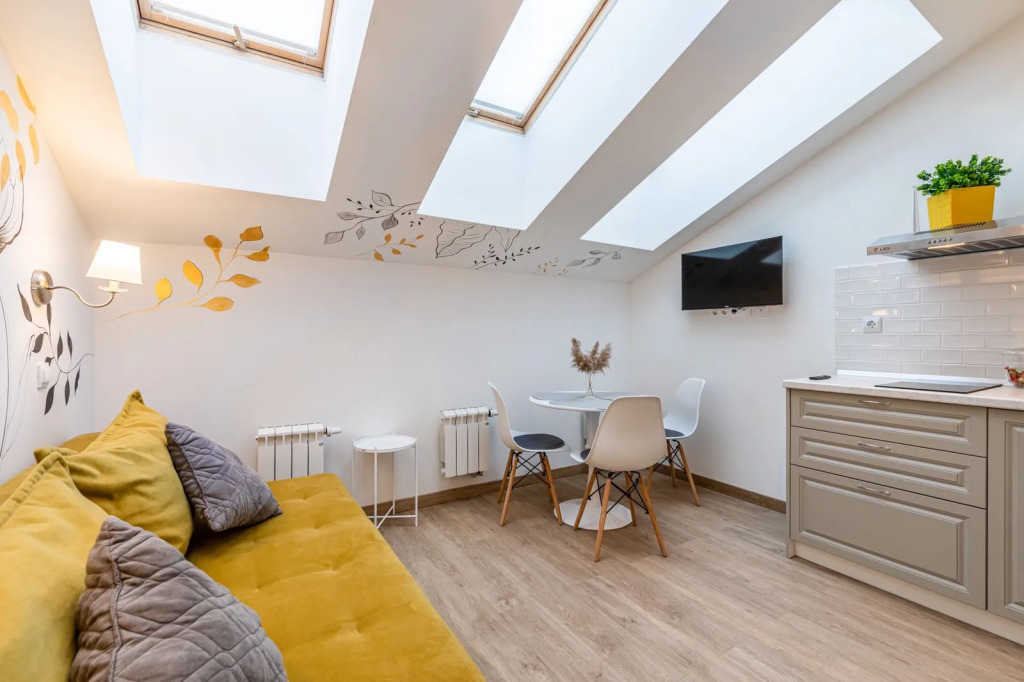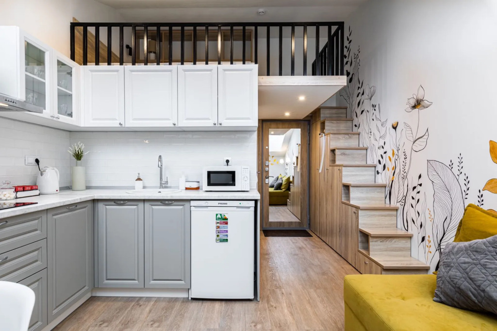 Квартира подходит для размещения до 4 человек. На втором уровне располагается спальня с кроватью. На первом уровне: кухня-гостиная с удобным диваном и Smаrt ТV, дизайнерской мебелью, необходимой техникой (СВЧ, морозильная камера, варочная панель и др.), ванная комната со стиральной машиной и многое другое.