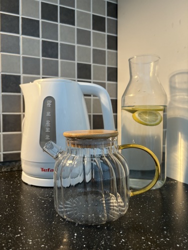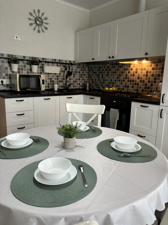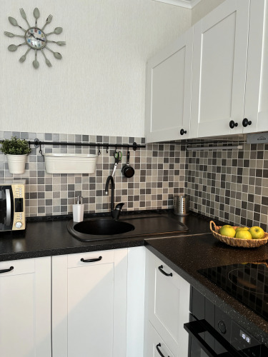 На кухне: посудомоечная машина, холодильник, электрическая плита, духовой шкаф, микроволновая печь, чайник, турка для кофе, посуда для приготовления еды и столовые приборы, фильтр для воды, губки и гель для мытья посуды. Также предоставляются соль, перец, чай, сахар, кофе, растительное масло, овсянка, макароны.