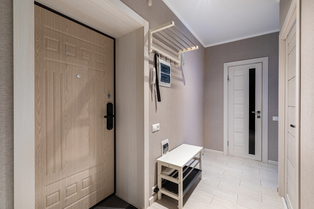 В квартире есть водонагреватель, кондиционер, утюг, сушилка для белья, гладильная доска, губка для обуви, ролик для одежды.