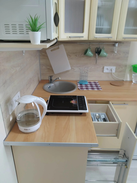 На кухне к услугам гостей стеклокерамическая плита, микроволновая печь, мини-бар, электрический чайник, посуда с антипригарным покрытием. Предоставляются специи, соль, кофе, чай, сахар, растительное масло.