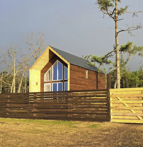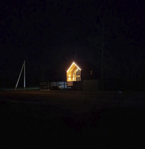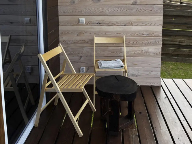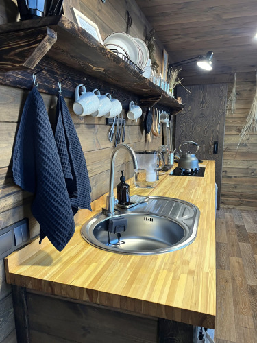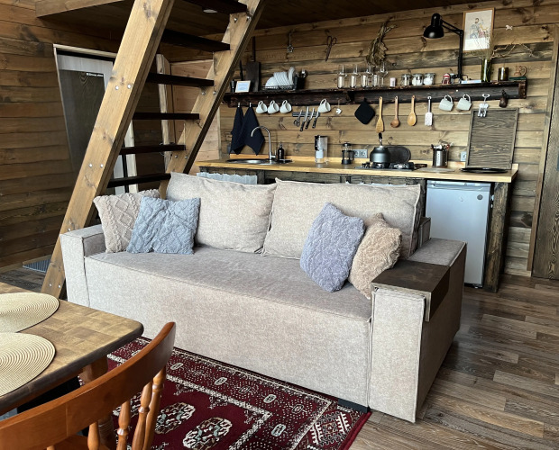 В доме есть оборудованная кухня: имеется варочная панель, холодильник, чайник, набор посуды и приборов. Спальня на 1 этаже имеет двуспальную кровать, на 2 этаже — двуспальная кровать либо две односпальных, на выбор гостей. В гостиной имеется раскладной диван.