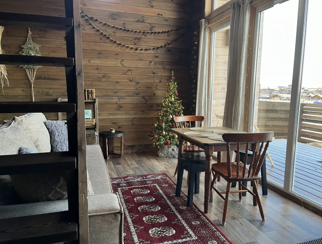 Гостевой дом является благоустроенным домом с кухней-гостиной, с двумя спальнями и санузлом и с панорамными окнами с видом на Байкал. Мебель и декор в доме выполнены своими руками.