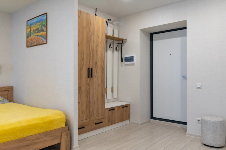Квартира-студия подходит для семейного отдыха, командировочных и деловых поездок, а также для гостей, приезжающих на лечение. Квартира вмещает до 4 гостей: двуспальная кровать king-size с ортопедическим матрасом средней жёсткости и подушками, раскладной диван на двоих.