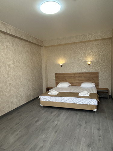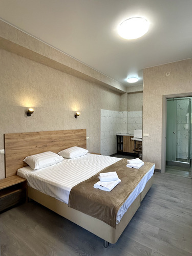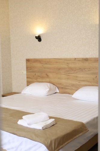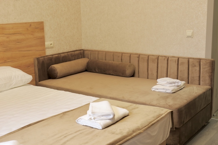 Номер категории «Стандарт Семейный» площадью 16 м2 вмещает 3х человек и создан для комфорта: - Уютная двуспальная кровать и комфортный диван-софа - Светлый просторный интерьер в теплых тонах - Современные удобства: ТВ, Wi-Fi, чайный набор, кондиционер, холодильник - Ванная комната с душем, средствами гигиены