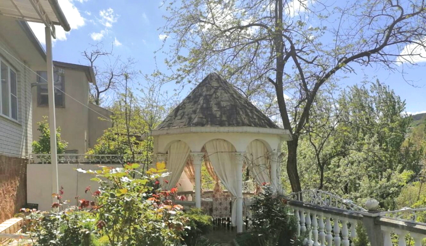 С территории дома слышно, как внизу шумит речка, поют птицы, во дворе цветут розы. Горячая вода и отопление регулируются собственной котельной.