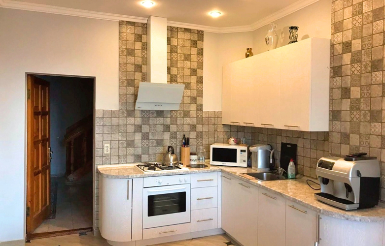 Кухня находится на первом этаже и укомплектована необходимым: посуда, столовые приборы, посудомоечная машина, микроволновая печь, зерновая кофемашина.