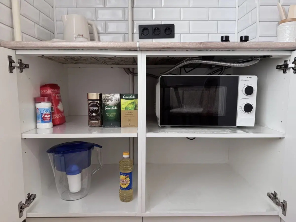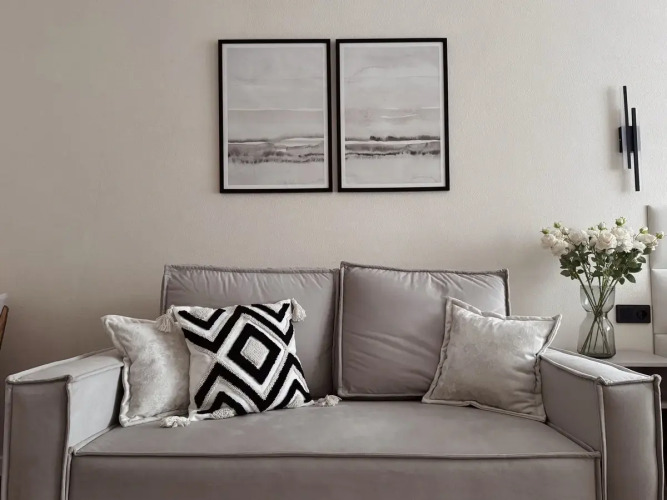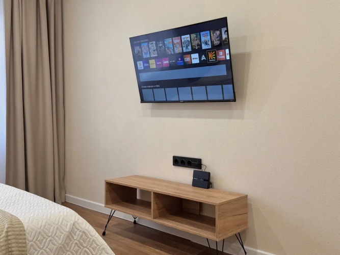 В квартире могут проживать до четырёх человек: двуспальный диван и модульная кровать гостиничного типа, трансформируемая в две односпальные. В квартире есть: безлимитный Wi-Fi, телевизор Smart TV, ортопедические матрасы, газовая плита, микроволновая печь, утюг, фен, полотенца.