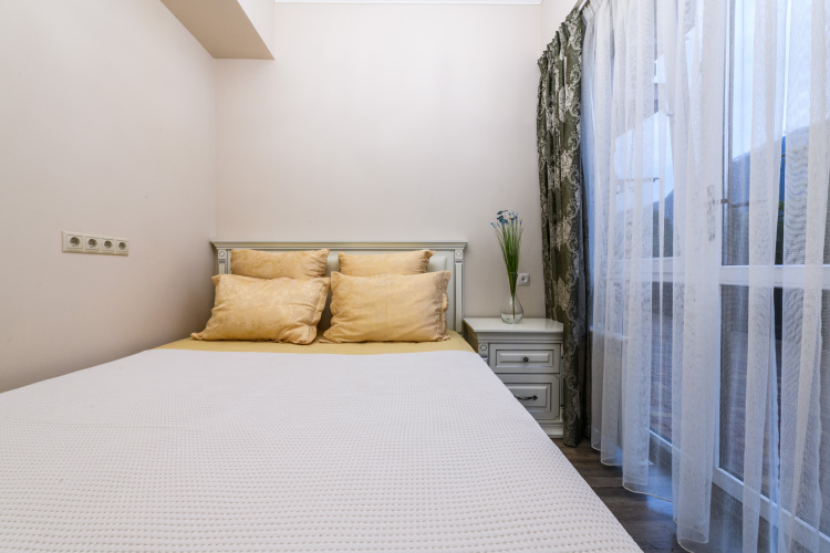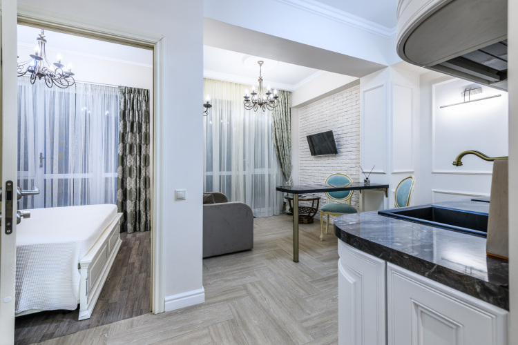 Апартаменты площадью 45 кв. м включают спальню с двуспальной кроватью и выходом на террасу, гостиную-кухню с диваном-кроватью, Smart TV и кондиционером. Кухня оснащена холодильником, плитой, духовкой и микроволновой печью. Имеется ванная комната со стиральной машиной и косметическими принадлежностями, а также личная сауна. Терраса оборудована мебелью для отдыха. Техническое оснащение включает тёплые полы, Wi-Fi и гладильные принадлежности.