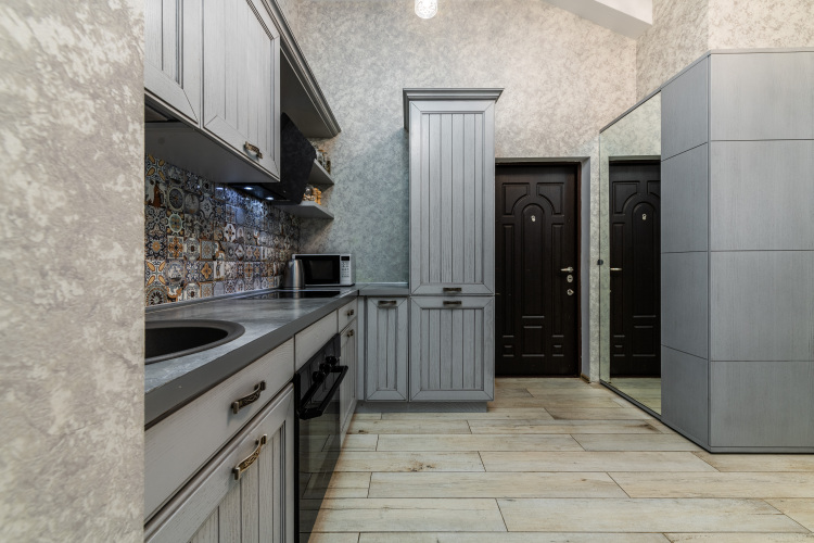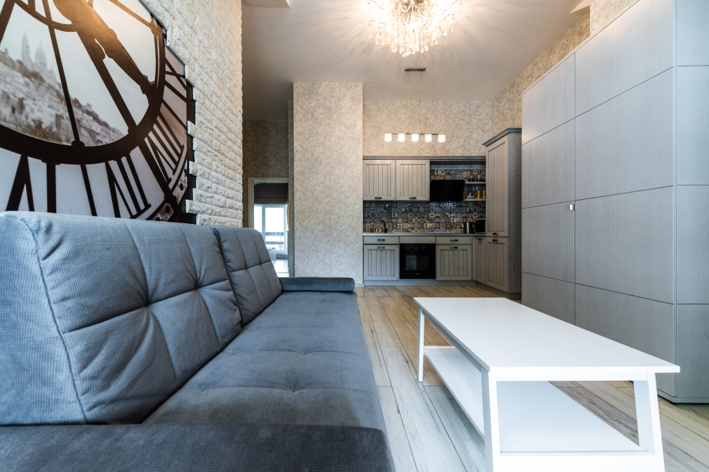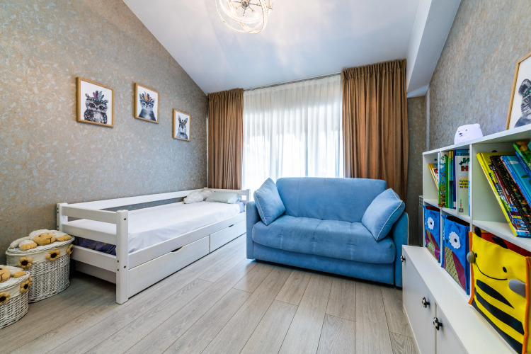 Площадь — 55 кв. м, возможно размещение до 6 гостей. В спальне установлена двуспальная кровать и есть отдельный балкон на солнечную сторону. В детской комнате — односпальная кровать и раскладной диван. В гостиной — ещё один раскладной диван, кондиционер и выход на второй балкон. Кухня оборудована плитой, духовкой, холодильником и всей необходимой посудой. В санузле установлена душевая кабина и стиральная машина. Доступен Wi-Fi.