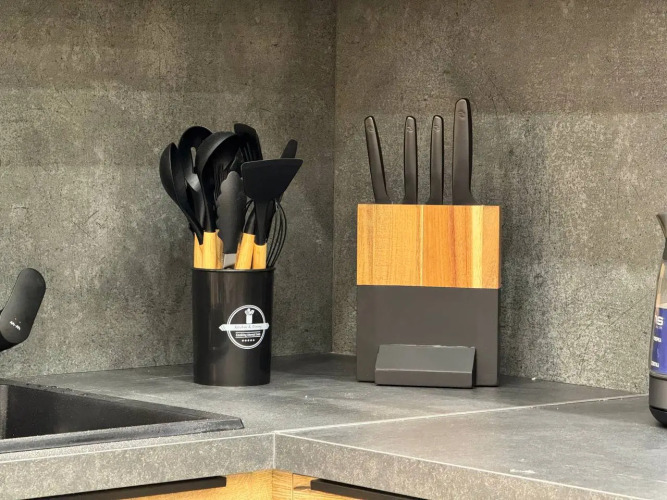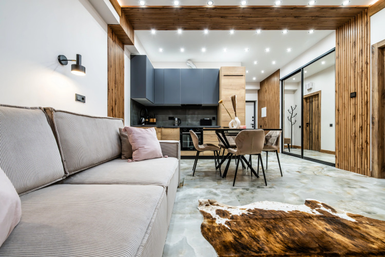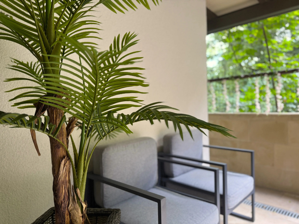 Площадь апартаментов — 40 м², возможно размещение до 4 гостей, подходит для пар или семей с детьми. В спальне расположена двуспальная кровать, в гостиной — раскладной диван. Из гостиной и спальни есть выход на террасу, где установлены качели-кокон и уличная мебель. В гостиной установлен биокамин. В апартаментах два Smart TV, два кондиционера, тёплые полы, духовка, варочная поверхность, посудомоечная машина, Wi-Fi и стиральная машина. Гостям предоставляются халаты и тапочки.