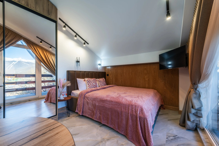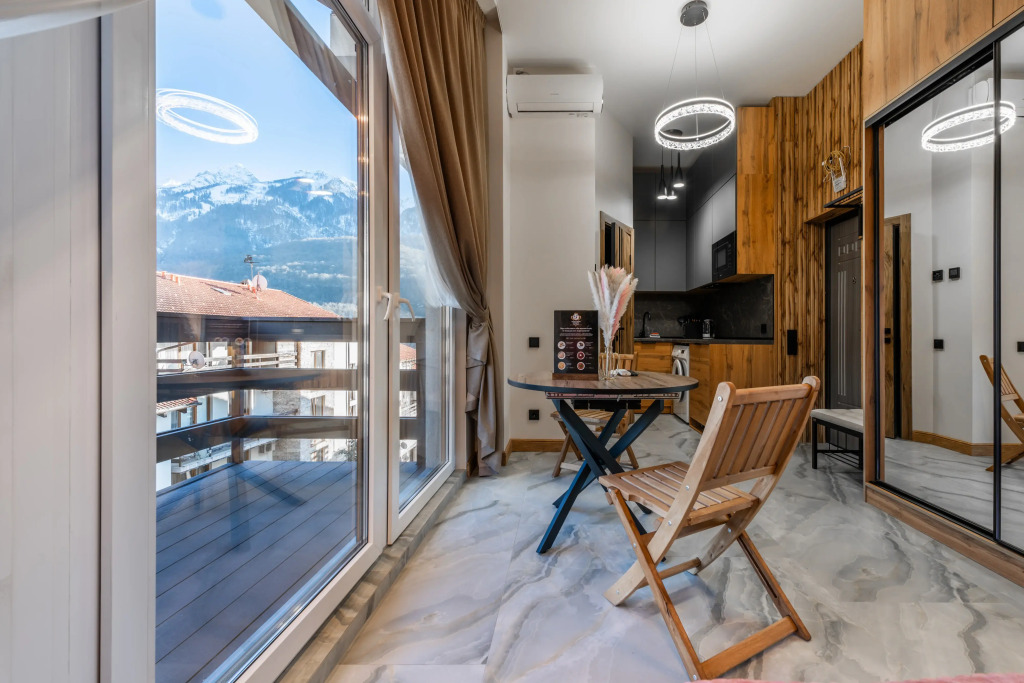 В студии 21 кв. м., которая находится на 4 этаже, в распоряжении гостей: ортопедический матрас, зеркальная стена с панорамой гор, белоснежные халаты/тапочки, Smart-TV, Wi-Fi, стиральная машина. Кухня-бар: варочная панель, микроволновка, посуда. Есть балкон с панорамным видом.