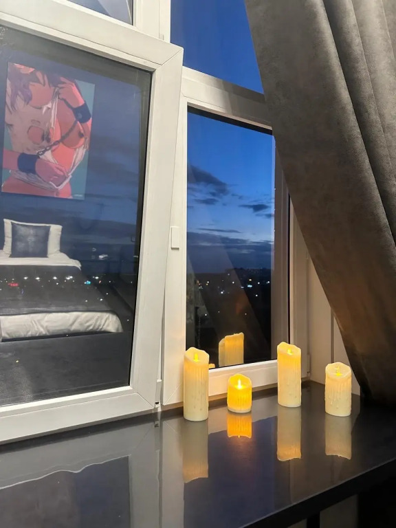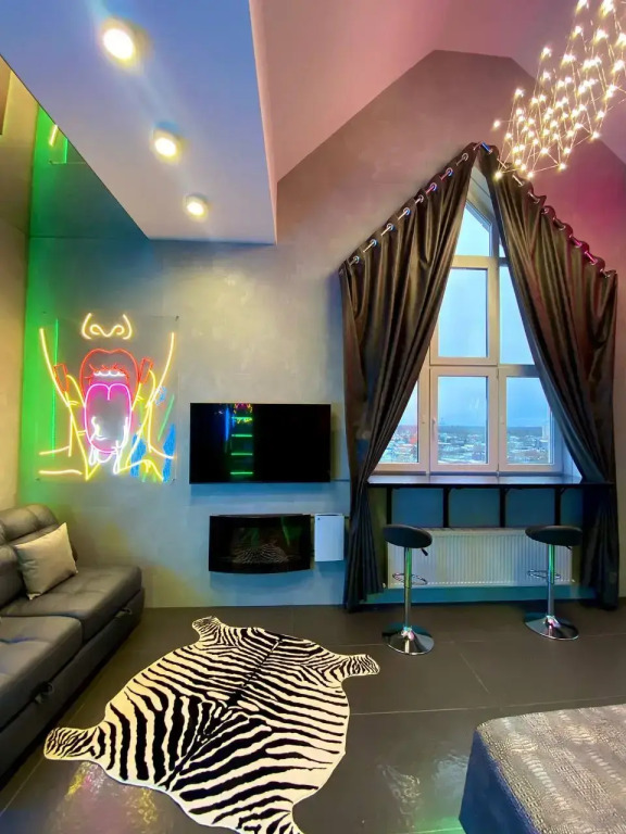 Апартаменты подходят для 2 гостей. В апартаментах: панорамный вид из окон, джакузи, камин, тропический душ, неоновая подсветка.