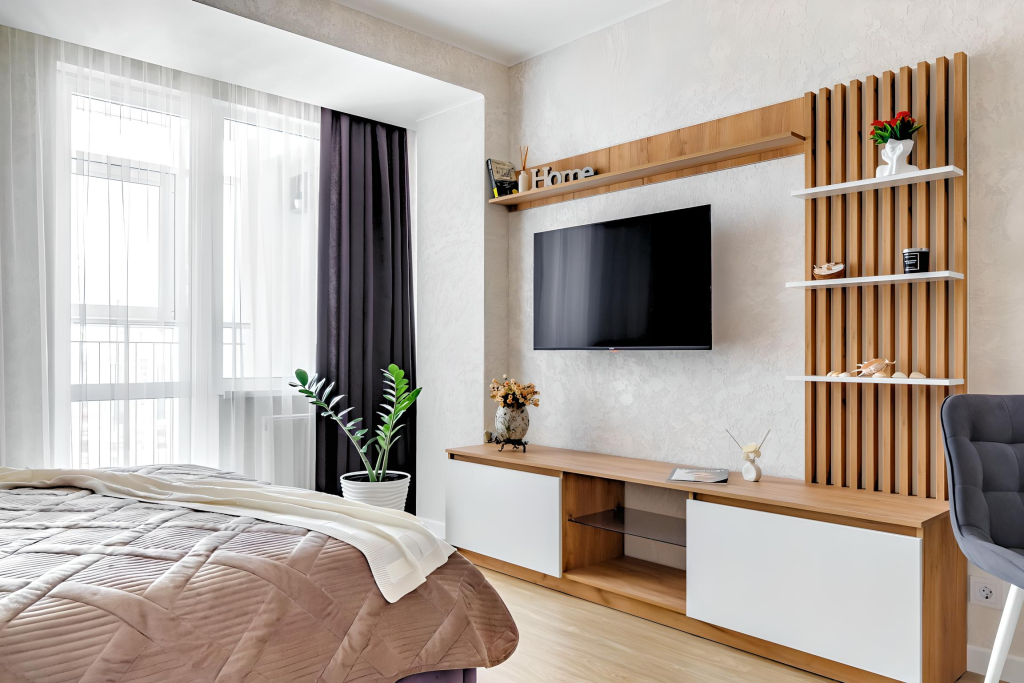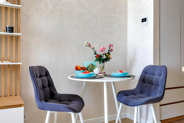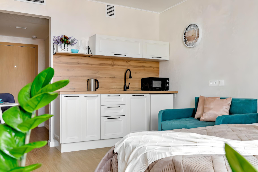 Апартаменты предназначены для размещения до 3 гостей. К услугам гостей: двуспальная кровать с ортопедическим матрасом 160Х200, диван, шторы Blackout, техника, посуда, электрический чайник, микроволновая печь, холодильник, фен, утюг, централизованное кондиционирование, декоративная подсветка, шкаф для хранения одежды, постельное бельё, полотенца для каждого гостя, туалетные принадлежности. Есть телевизор FULL HD, Smart TV и бесплатный Wi-Fi.