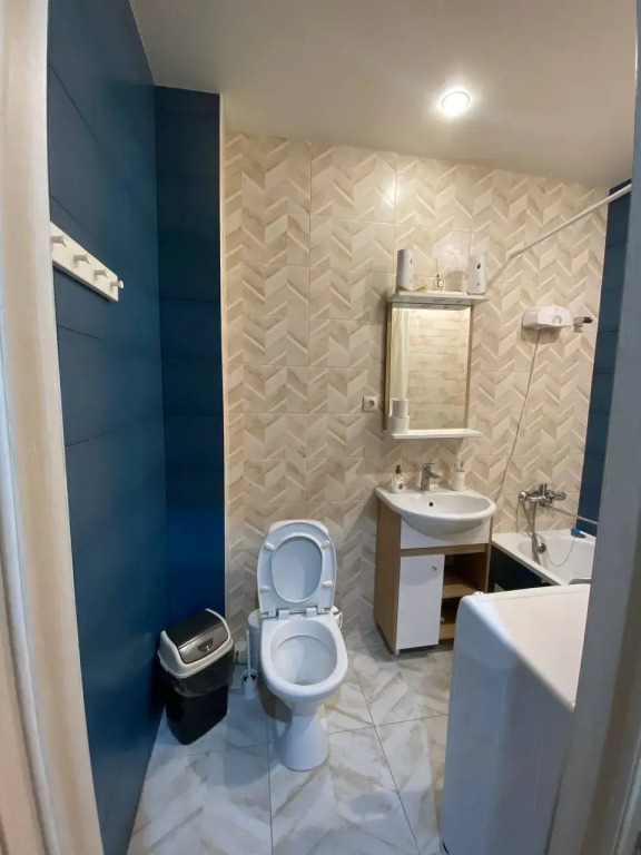 Есть собственная ванна со всеми косметическими принадлежностями, средствами гигиены, феном.