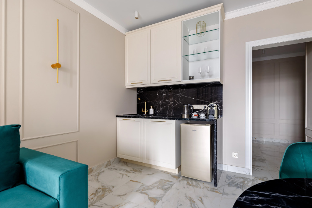 В номере гостей ждут телевизор и собственная кухня с кофемашиной и необходимыми мелочами.
