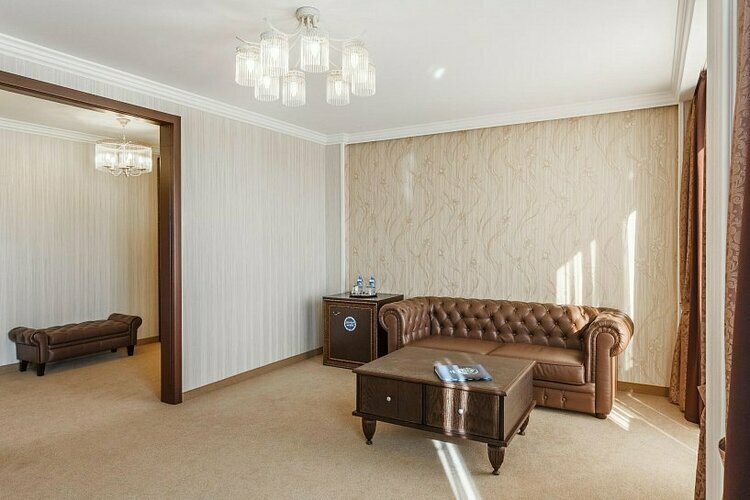 Просторный разделенный на две зоны номер. Гостиная с роскошным кожаным диваном и будуаром и спальня с одной большой кроватью. Возможна установка дополнительных спальных мест - еврораскладушки.