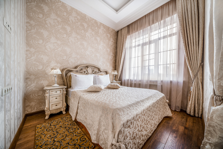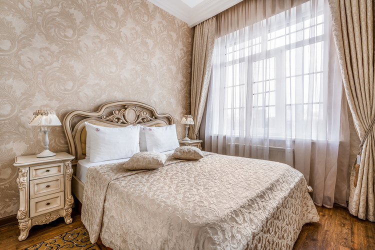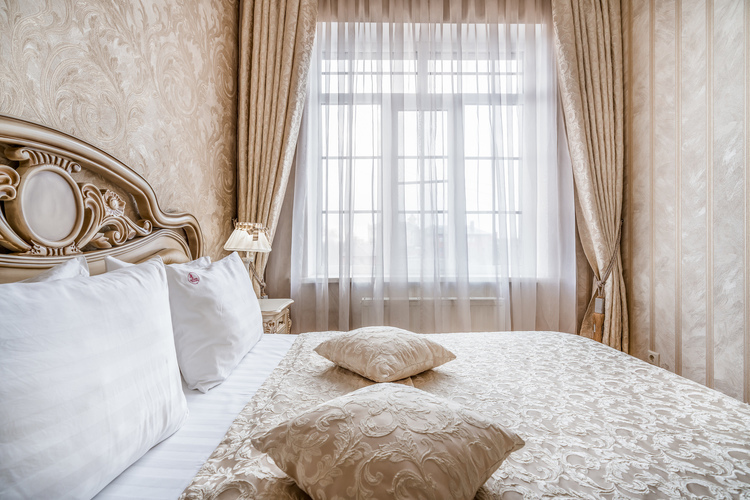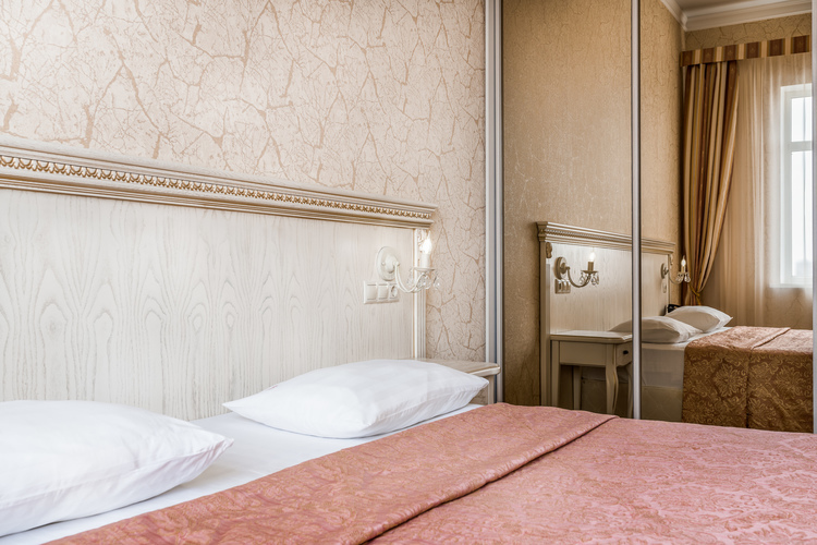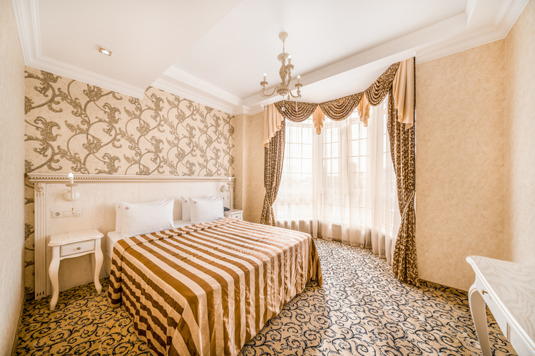 Просторный номер с двуспальной кроватью, с ортопедическим матрацем и дополнительно поверх снабженную топпером что придает очень высокий уровень комфорта во время сна, которую также по желанию гостей можно трансформировать в две односпальные кровати. В номере есть прикроватные тумбы с ящиками для вещей и прикроватные бра. Шкаф-купе с вешалками и полками, сейф, мини-бар, ТВ а также стол и стул. В ванной комнате есть большая ванна и вся необходимая сантехника.
