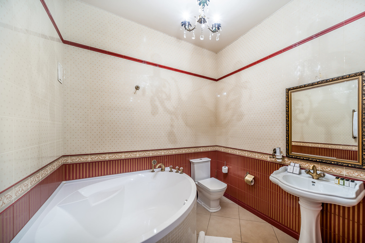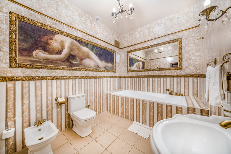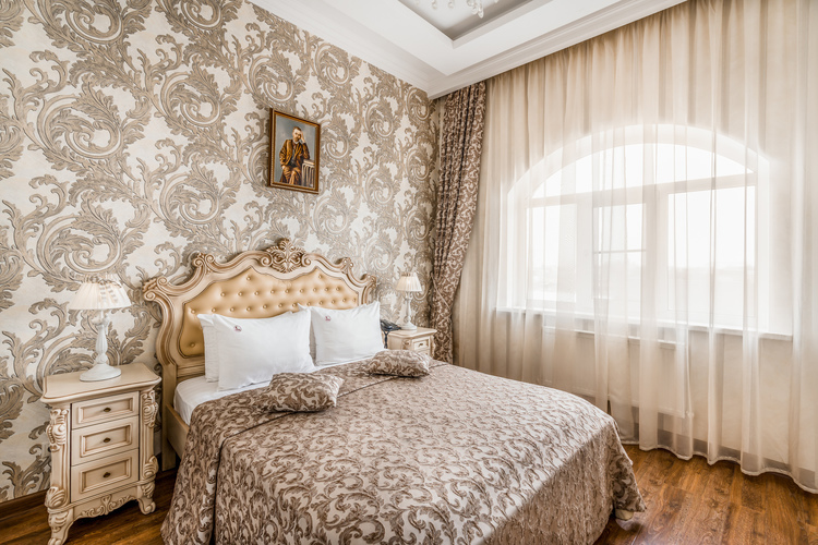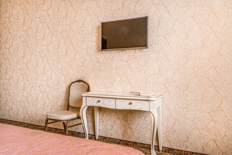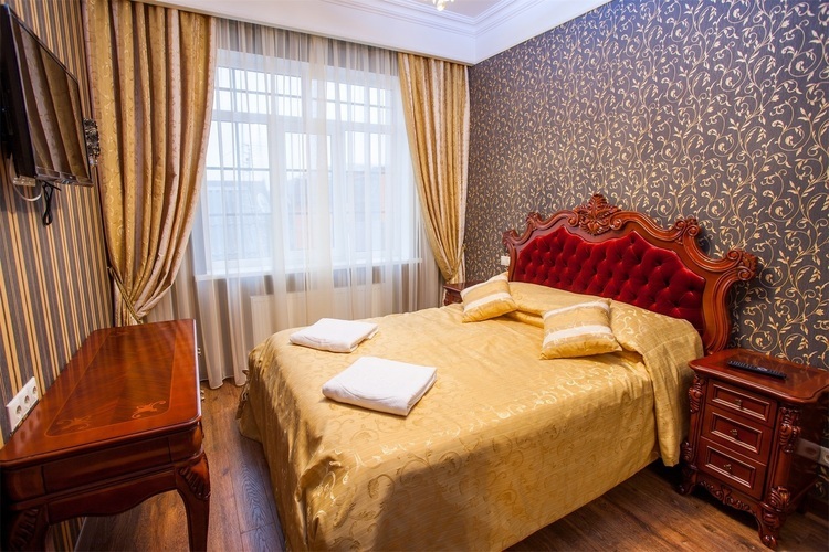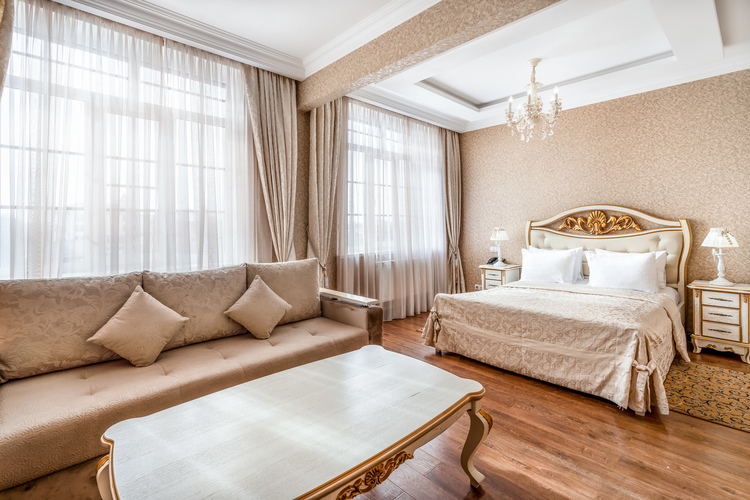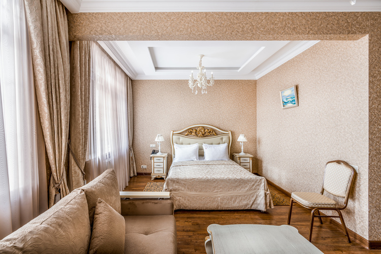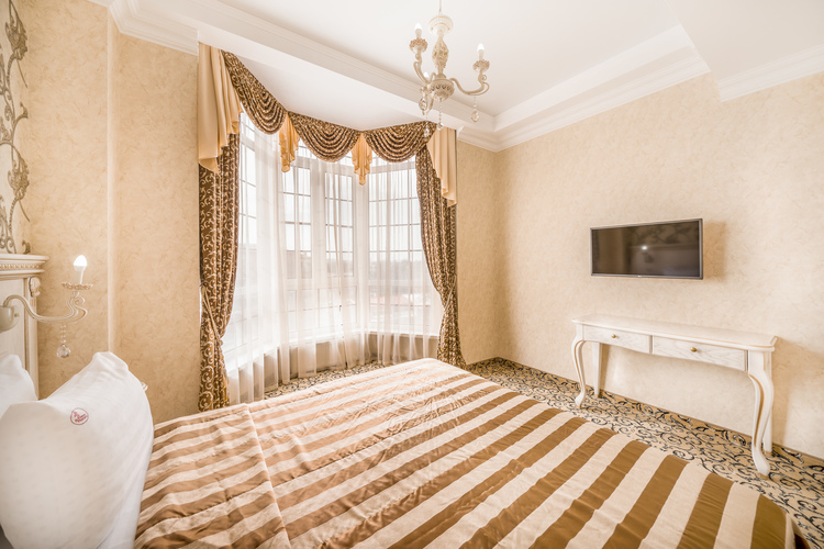 Большой и роскошный номер. Номер оборудован системой климат-контроля и рециркуляцией свежего воздуха с открытого пространства. В номере есть двуспальная кровать с ортопедическим матрацем и прикроватными тумбами с бра. Санузел оборудован большой ванной, биде, раковиной и унитазом. В номере есть мягкая зона, с журнальным столиком где можно посмотреть телевизор с выходом в интернет. В номере имеются стулья и рабочий стол, шкаф-купе с полками и вешалками, сейф, мини-бар а также комод.