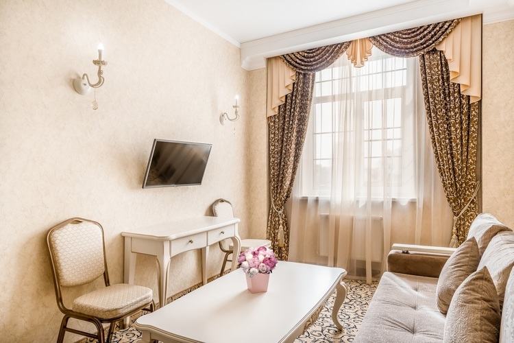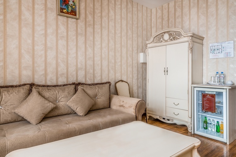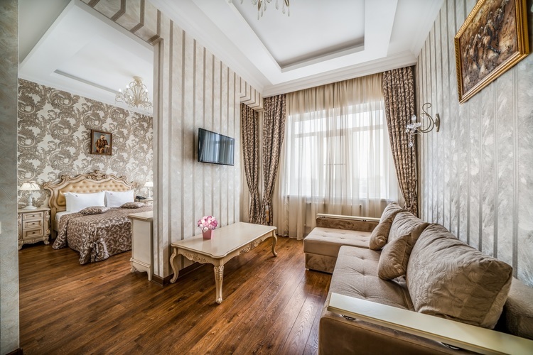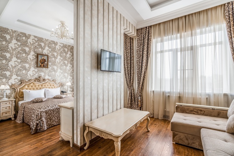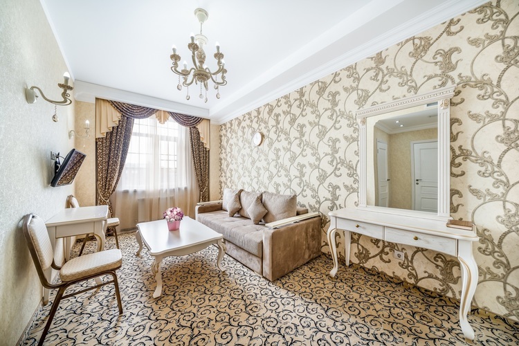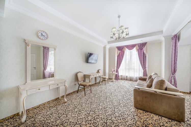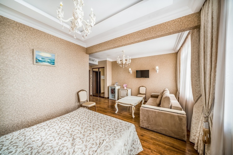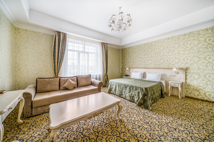 Номер с увеличенной полезной площадью, и снабженный мягкой мебелью а также журнальным столиком, трюмо, рабочем столом и стульями. В номере имеется двуспальная кровать с ортопедическим матрацем и топпером для более комфортного сна. Завтрак можно заказать на утро в номер, он бесплатный, либо спуститься на первый этаж на лифте и по завтракать в ресторане «Вишневый сад». В номере имеется ТВ, как и в других номерах шкаф-купе с полками и вешалками, сейф, мини-бар, климатическая система.