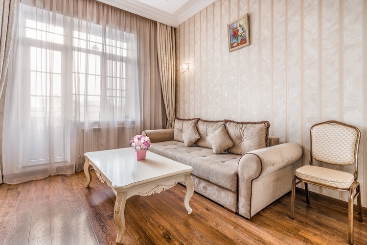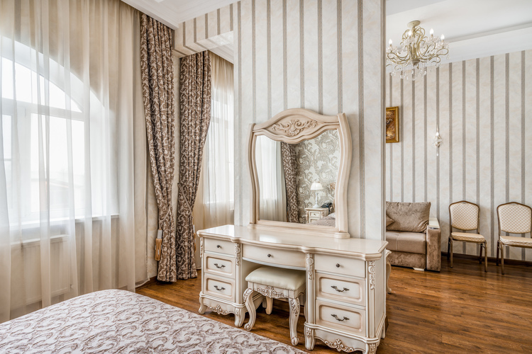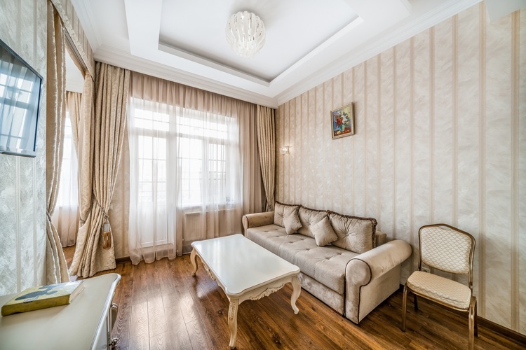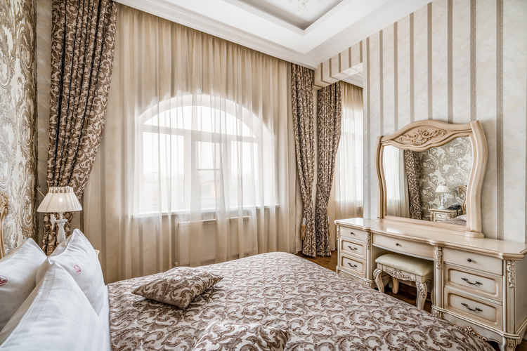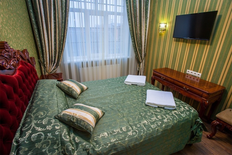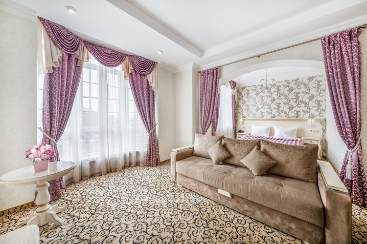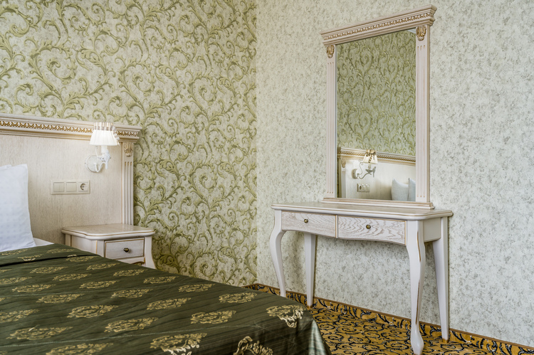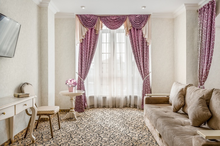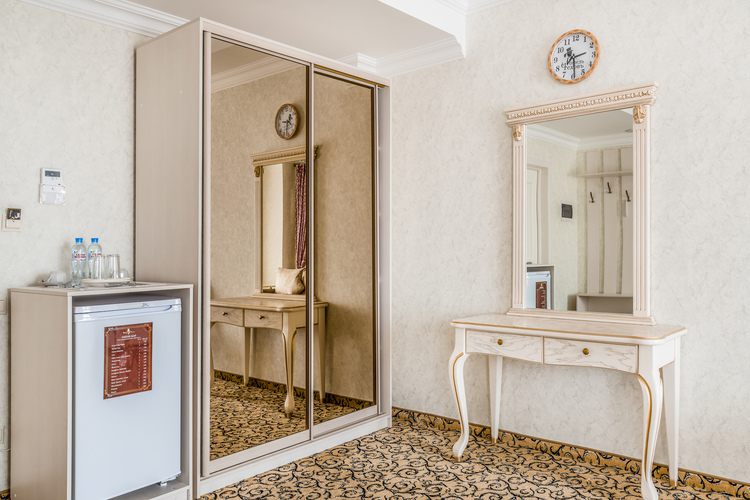 Номер с увеличенной полезной площадью, и снабженный мягкой мебелью а также журнальным столиком, трюмо, рабочем столом и стульями. В номере имеется двуспальная кровать с ортопедическим матрацем и топпером для более комфортного сна. Завтрак можно заказать на утро в номер, он бесплатный, либо спуститься на первый этаж на лифте и по завтракать в ресторане «Вишневый сад». В номере имеется ТВ, как и в других номерах шкаф-купе с полками и вешалками, сейф, мини-бар, климатическая система.