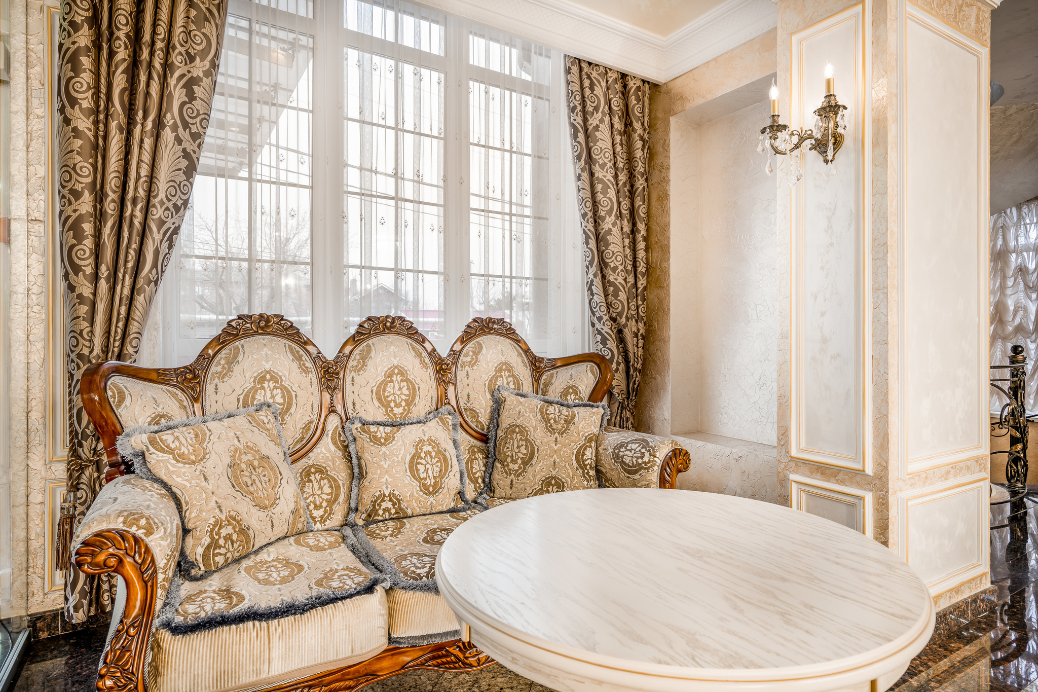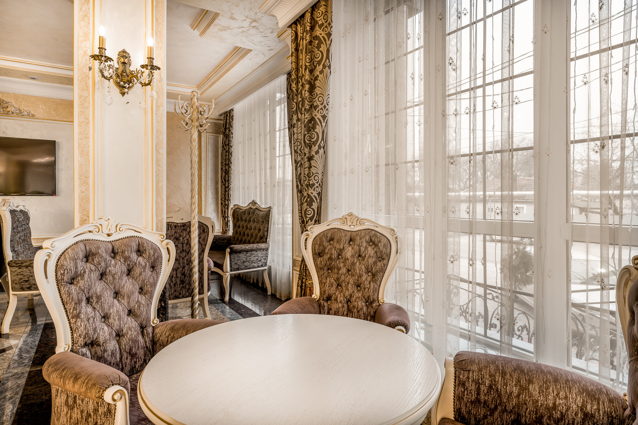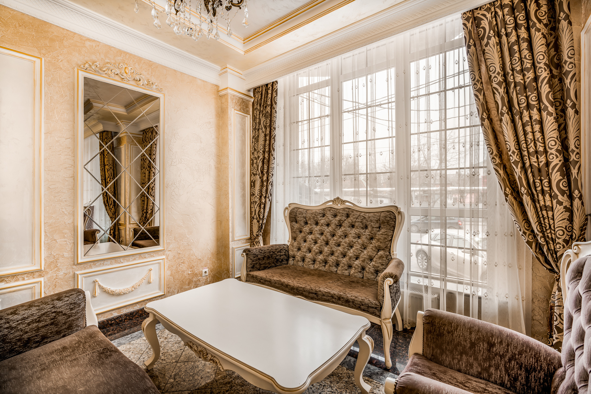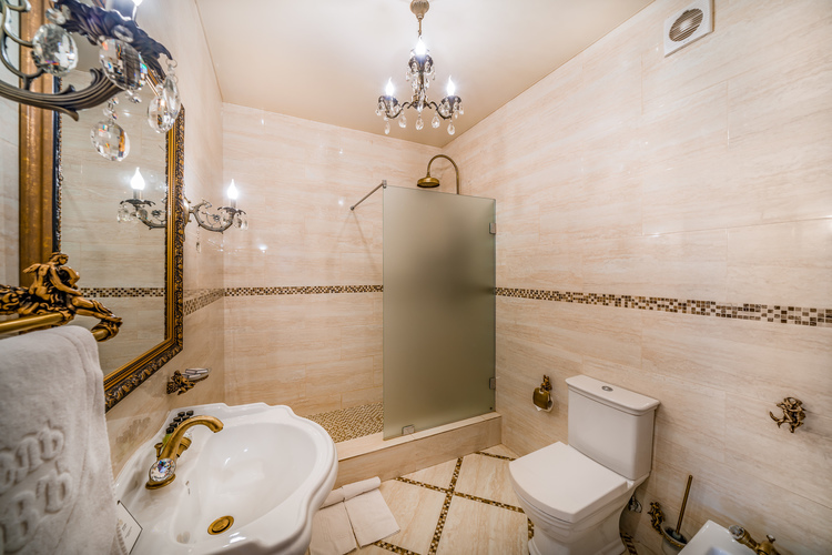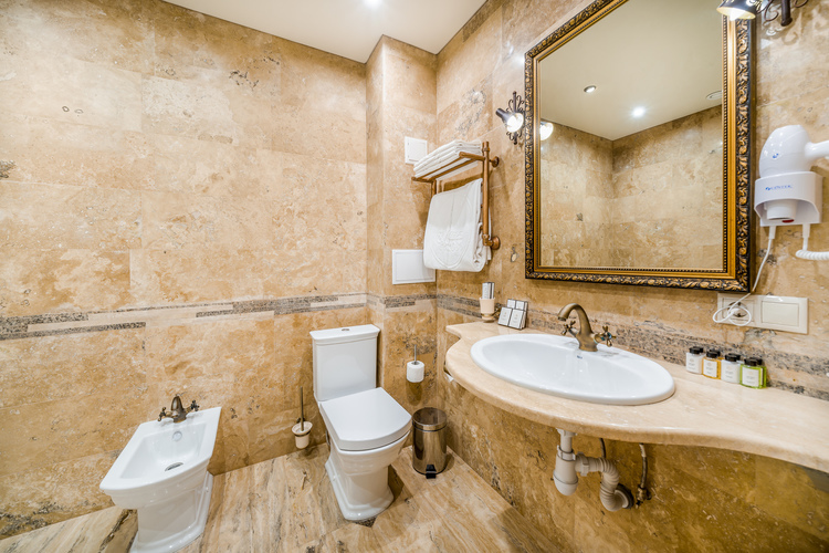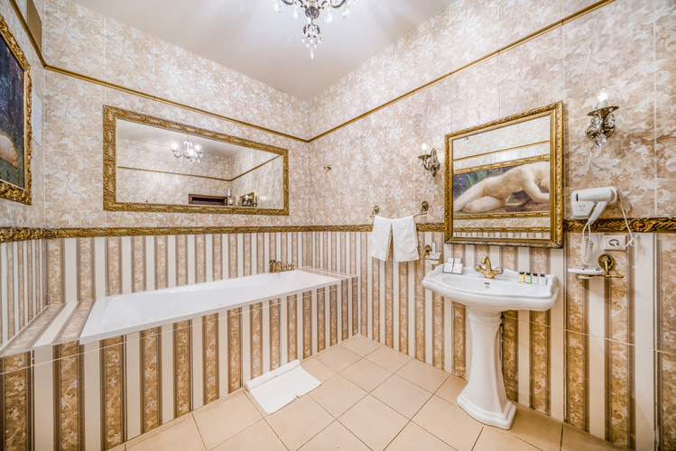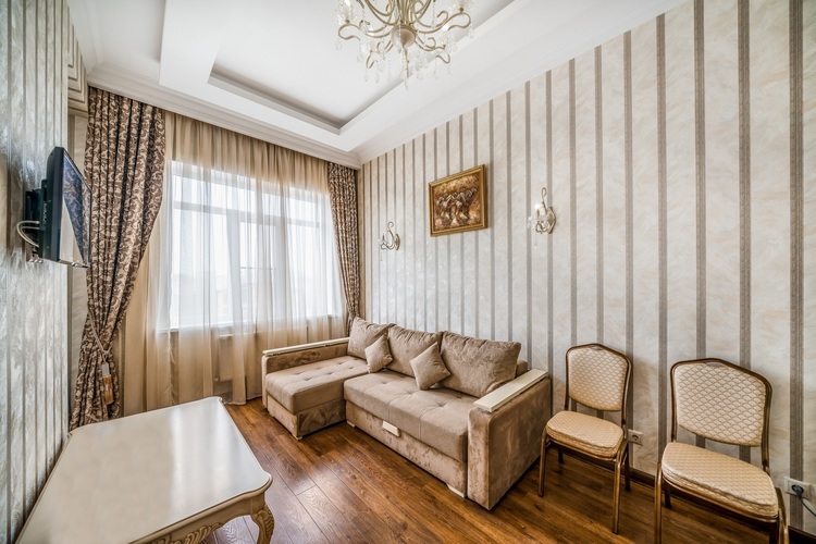 Роскошный номер с дополнительным пространством за счет балкона с видом на город. Номер спланирован на отдельные зоны для удобства нахождения. Отдельная спальная зона с двуспальной кроватью и прикроватными тумбами с бра и ящиками. Вторая зона - гостиная, в которой находится мягкая мебель, журнальный столик, трюмо с пуфиком а также шкаф для вещей и мини-бар. С гостиной имеется выход на балкон. Санузел оборудован большой ванной, биде, раковиной и унитазом. В номере есть телевизор, телефон, Wi-Fi.