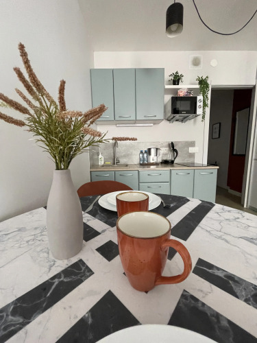 В апартаментах есть необходимая бытовая техника — стиральная машина, холодильник, фен, телевизор, утюг, микроволновая печь, чайник, а также гейзерная кофеварка. В распоряжении гостей укомплектованная кухонная зона с обеденным столом. Здесь есть чай, кофе, сахар, крупы, посуда и другие необходимые принадлежности.