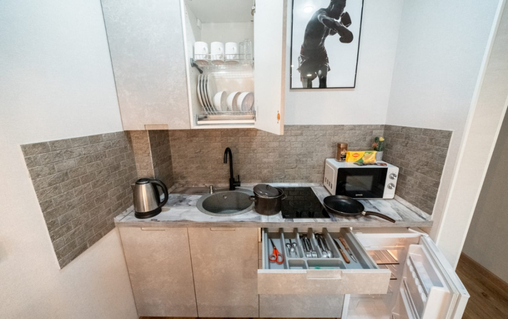 В апартаментах возможно проживание до 2 человек. В апартаментах работает Wi-Fi, Smаrt ТV, очки виртуальной реальности. Гостям предоставляются гигиенические принадлежности: шампунь, мыло, гель для душа, одноразовые зубные щётки, стиральный порошок, полотенце и постельное бельё. Есть кухонные принадлежности: электрический чайник, холодильник, плита, микроволновая печь. Также имеется стиральная машина, фен и утюг.