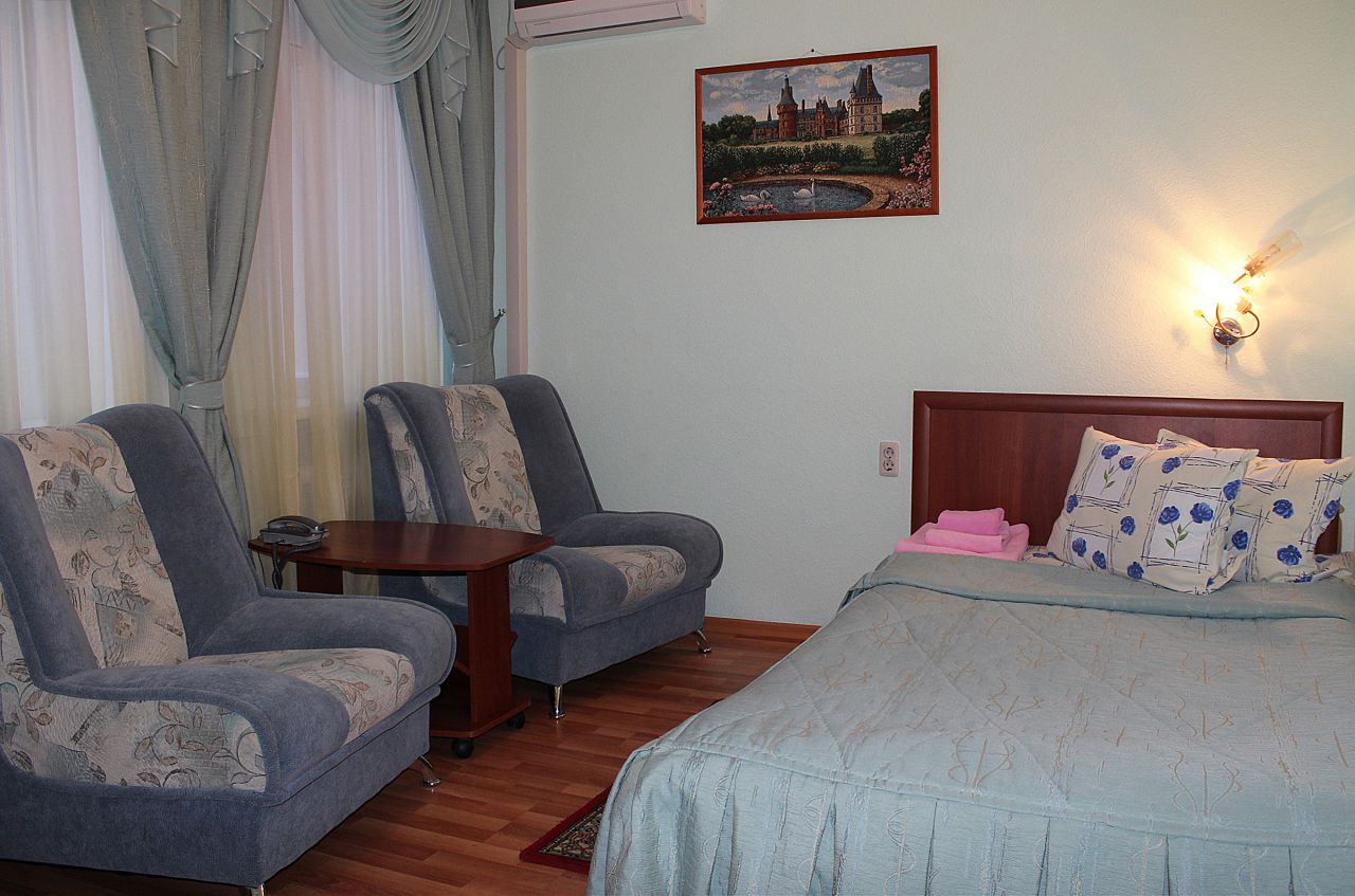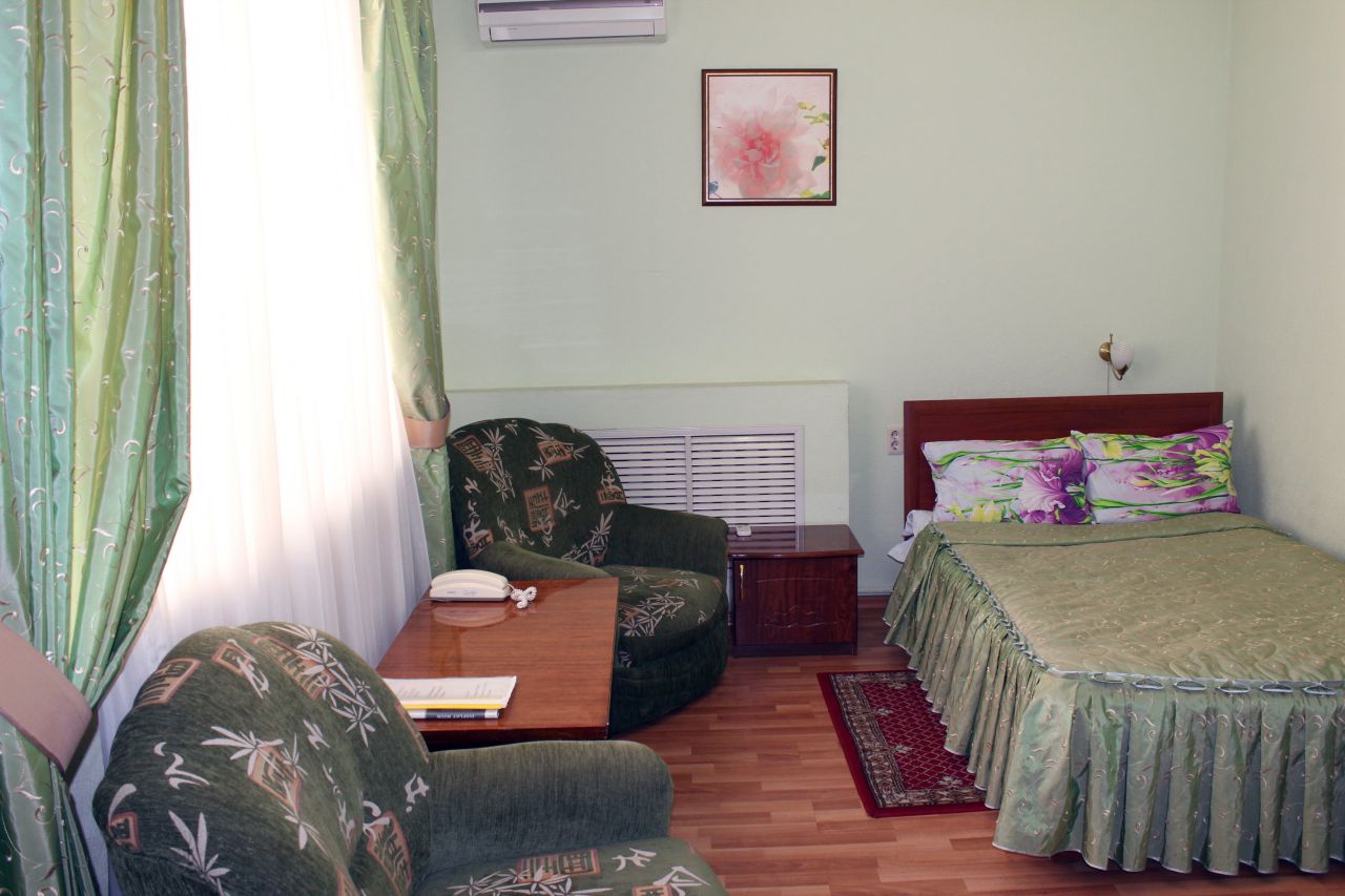В гостинице 36 номеров на 48 мест. Вам предложат апартаменты класса люкс, полулюкс, стандарт и номера экономы, которые приятно удивят своей стоимостью. В каждом номере независимо от категории есть телевизор, холодильник, кондиционер, санузел. Бесплатная парковка и высокоскоростной Wi-Fi.
