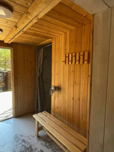 Домики построены из натурального дерева. В каждом номере есть тёплый пол, сантехника с инсталляцией, blackout-шторы, пуховое одеяло, халаты, Wi-Fi и кофемашина.
